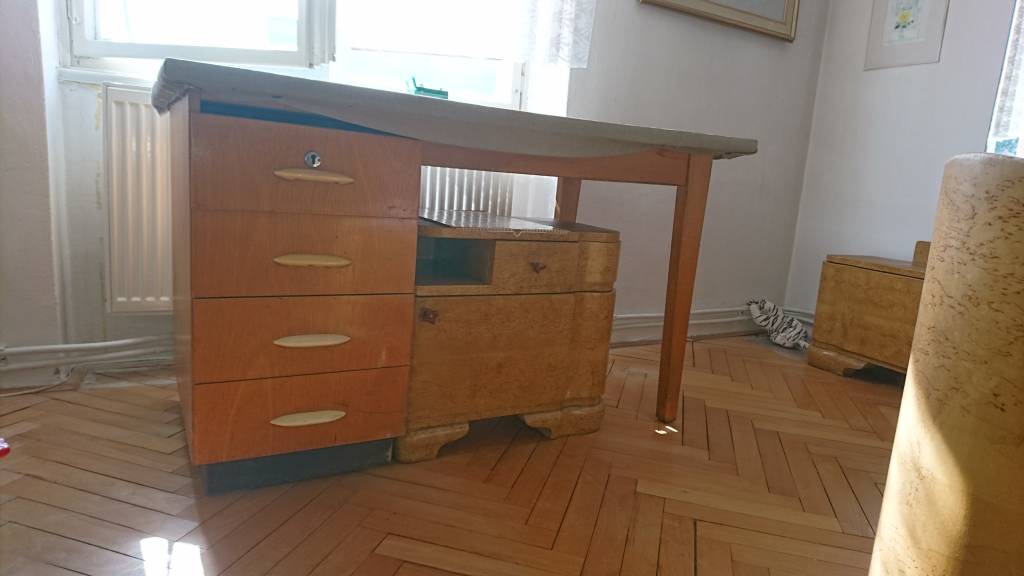 Starý psací stůl se šuplíky. Vše funkční, ale opotřebované. Do dílny nebo garáže v pohodě.