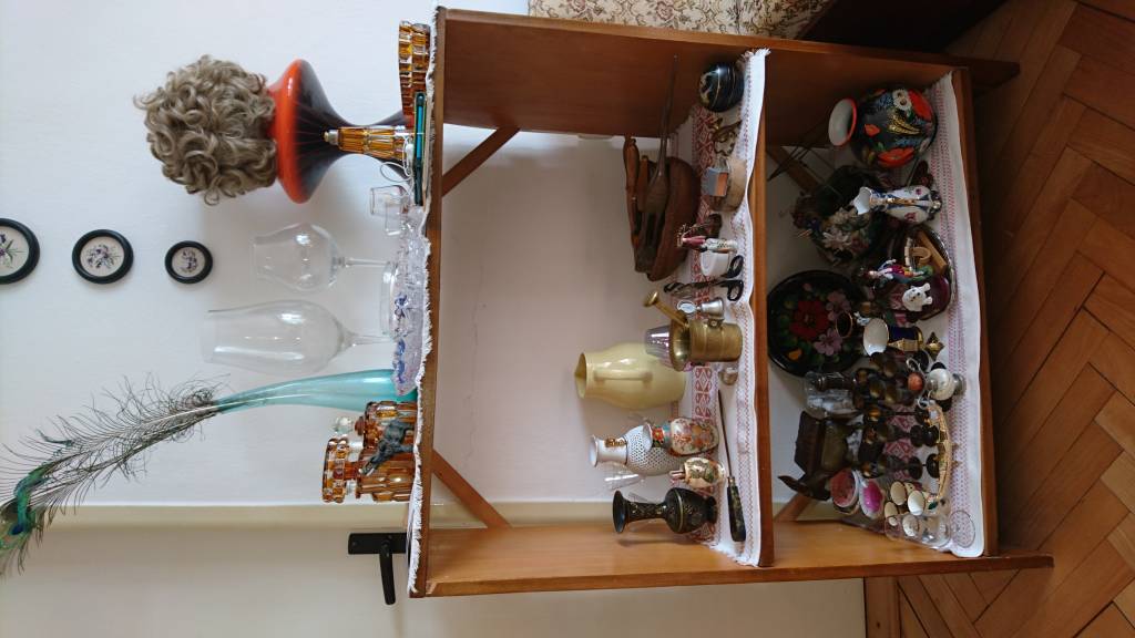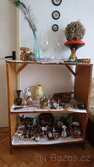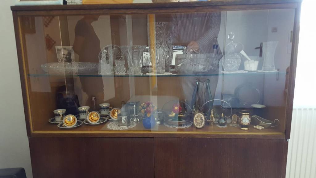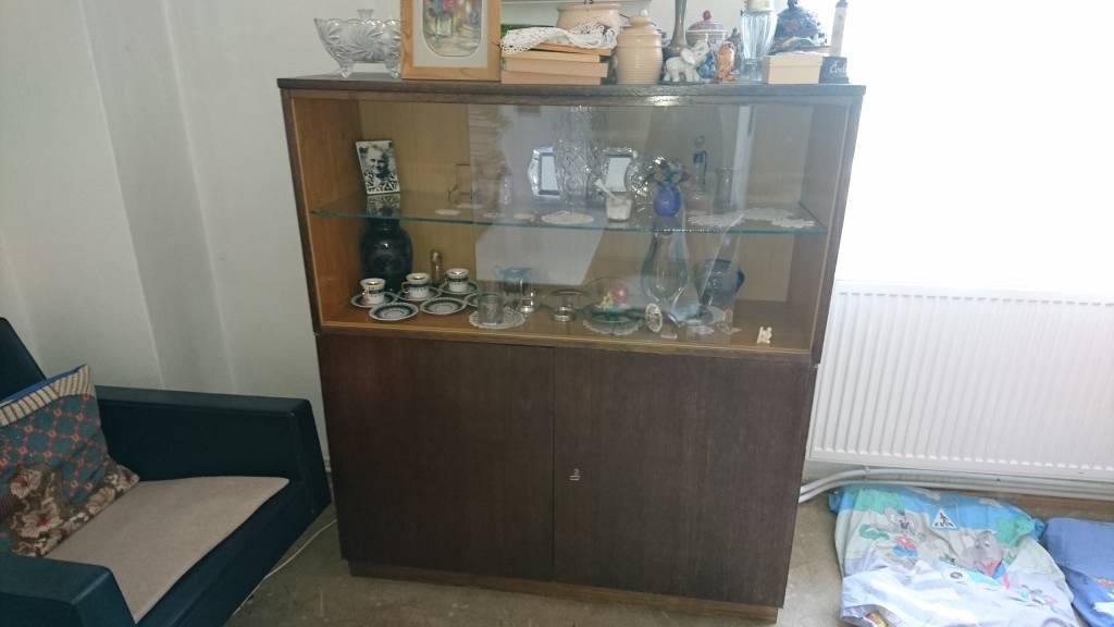 Uzamykatelná skříňka s prosklenou vitrínkou a k tomu nižší policový