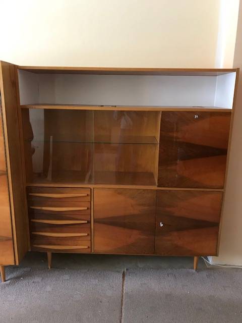 Daruji starou obývací stěnu v zachovalém stavu. Ideálně jako celek. Rozměry: Knihovna - šířka 100 cm, hloubka 40 cm, výška 140 cm (výška nožek od země 19.5 cm). Skříň - šířka 100 cm, hloubka 57,5 cm, výška 140 cm. Šuflata + bar - šířka 150 cm, hloubka 40 cm, výška 140 cm Lokalita - Kuřim