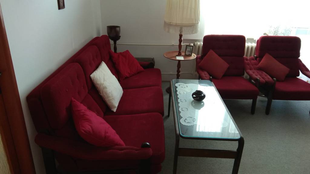Rozkládací gauč a dvě křesla. Lehká konstrukce, masiv. Stolek masiv + krycí sklo. Za odvoz.