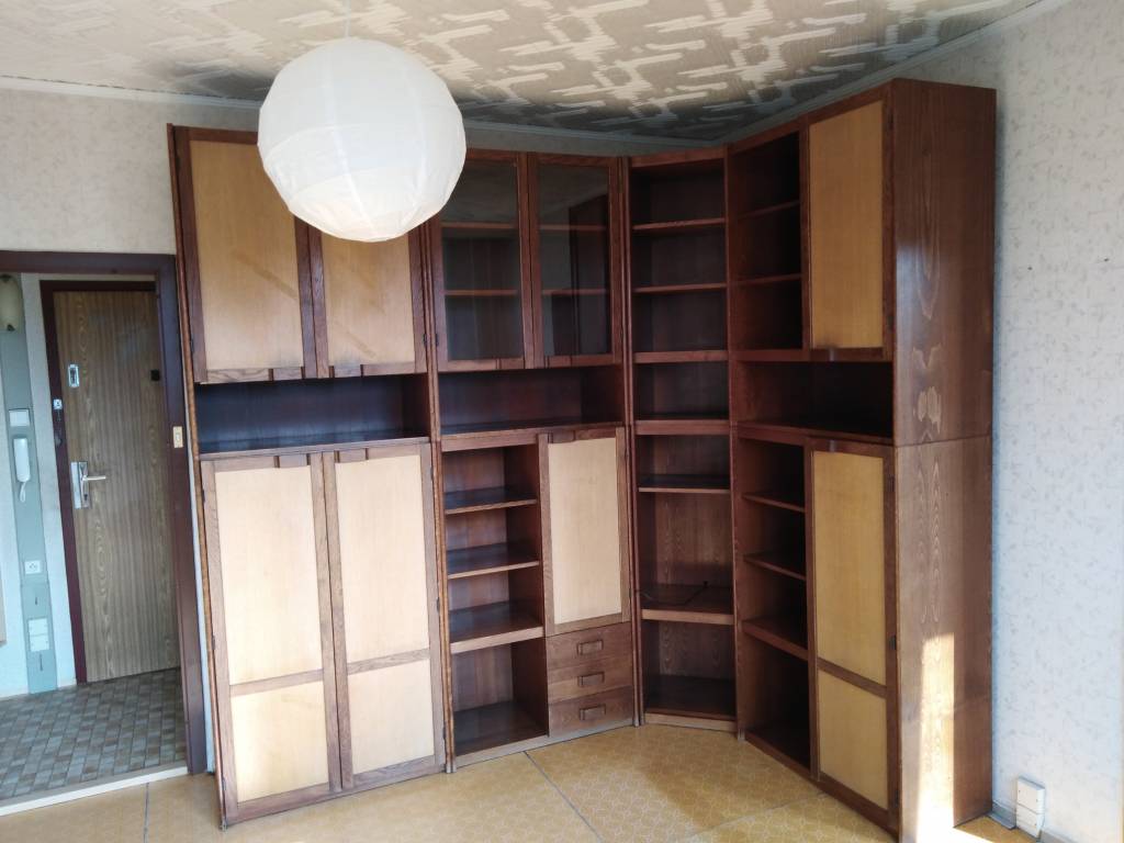 Rohová stěna výška cca 220 cm mořené dřevo, bez významých vad. Skříňky, zásuvky, skleněné vitríny. Vše funkční. Mnoho úložného prostoru.Jednotlivé díly jsou cca 140x100cm. Nerozebírá se na prkénka. Podmínka odvézt vše. Nábytek je na Mánesově ulici v Přívozu.