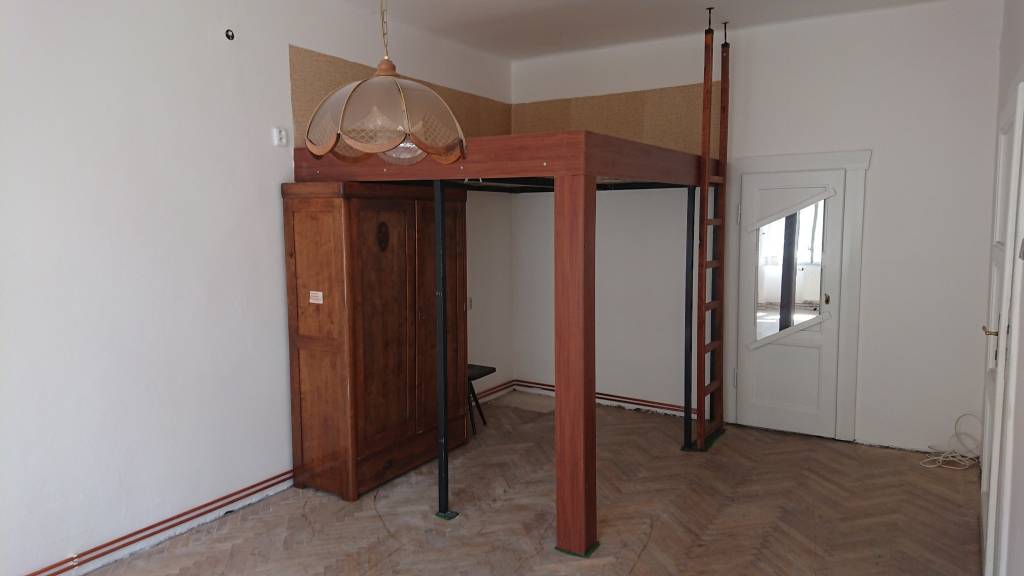 Patrová postel s žebříkem bez matrace. Jeklová lakovaná konstrukce s obklady a třemi nohami. Do zdi uchyceno asi 8 vruty a rohovým profilem (jednoduchá demontáž).