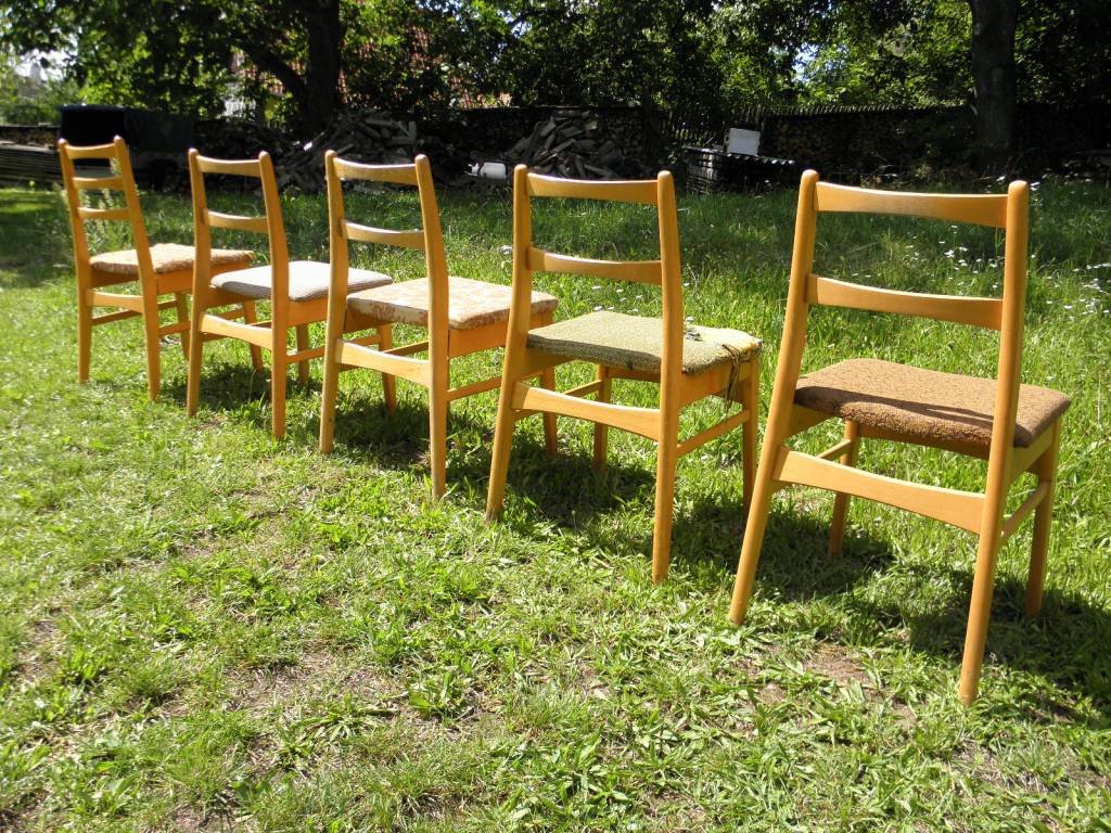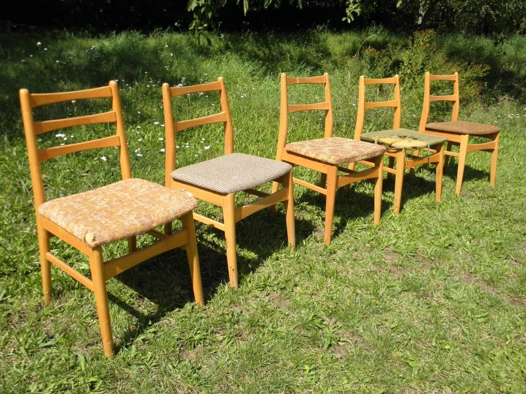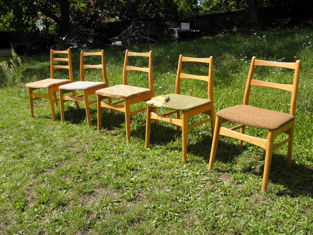 Nerozviklané. Sedáky budou chtít nově potáhnout. V horším i lepším stavu. 70. léta. Jedna židle je značena Libena Vesec u Liberce.