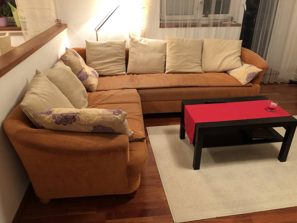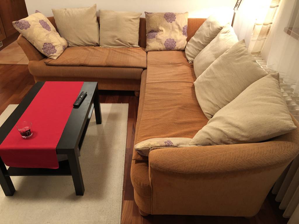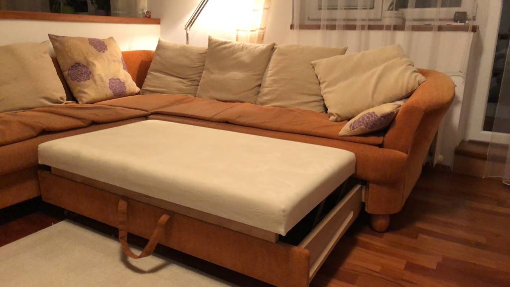 Daruji za odvoz rozkládací sedací soupravu ve tvaru písmene L. Medová barva. Rozměry 2,3 x 2,5.