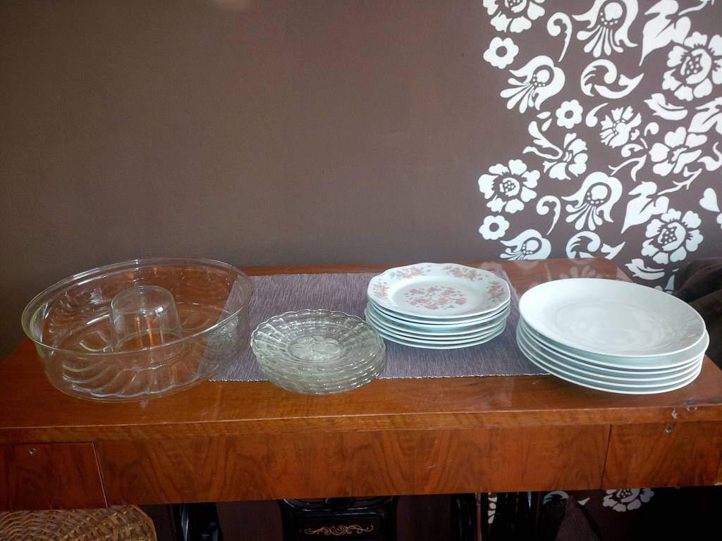 Mělké talíře/talířky (nepoužívané), skleněná forma na bábovku (párkrát používaná). Vyzvednutí na Praze 8, pouze vše z fotky celý komplet.