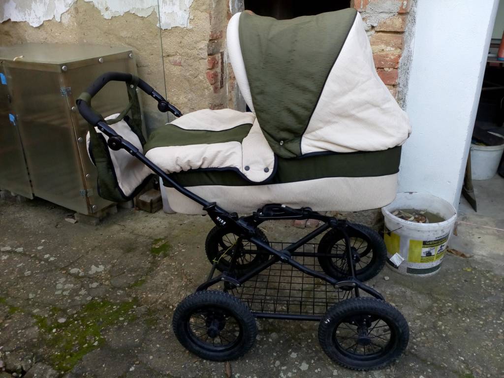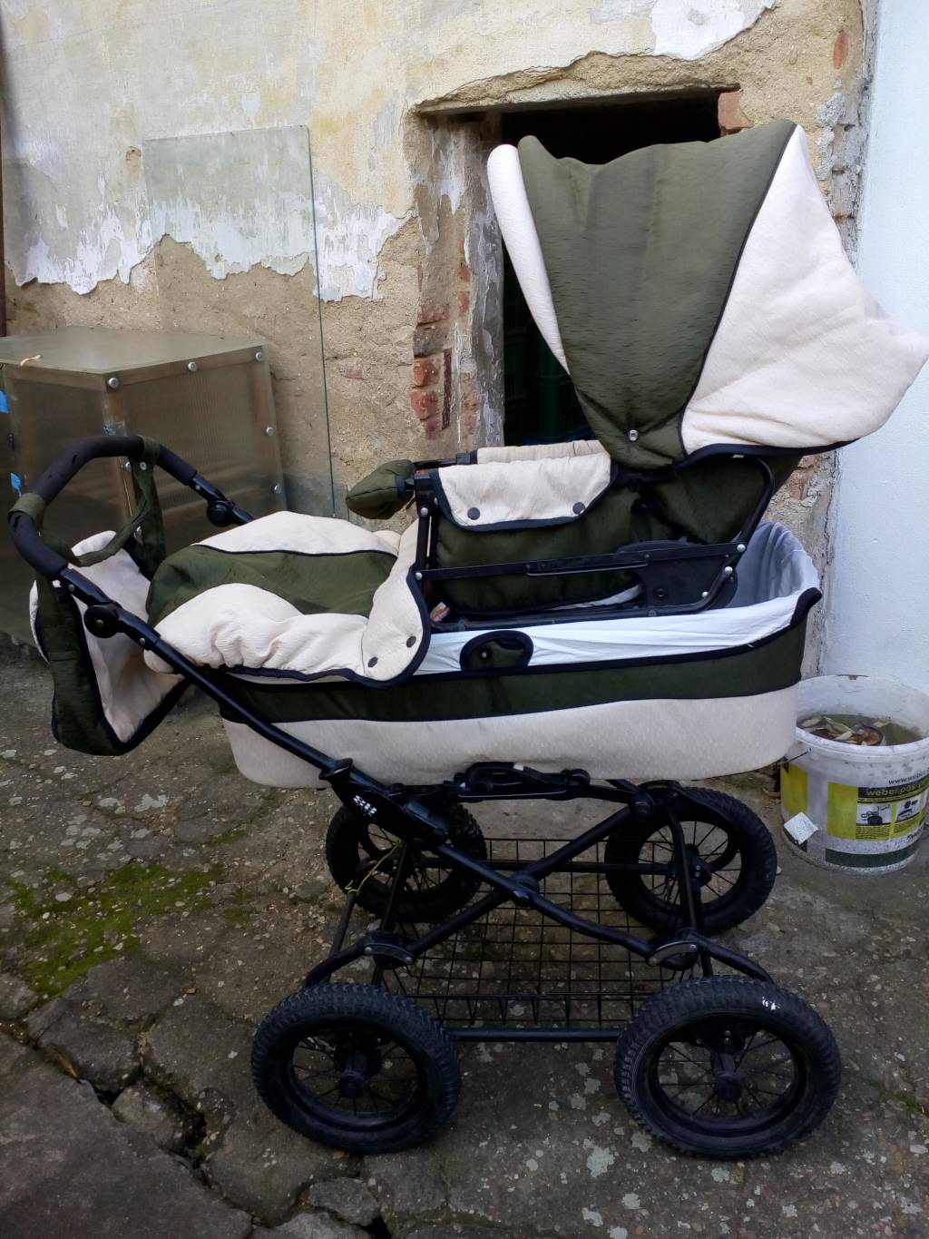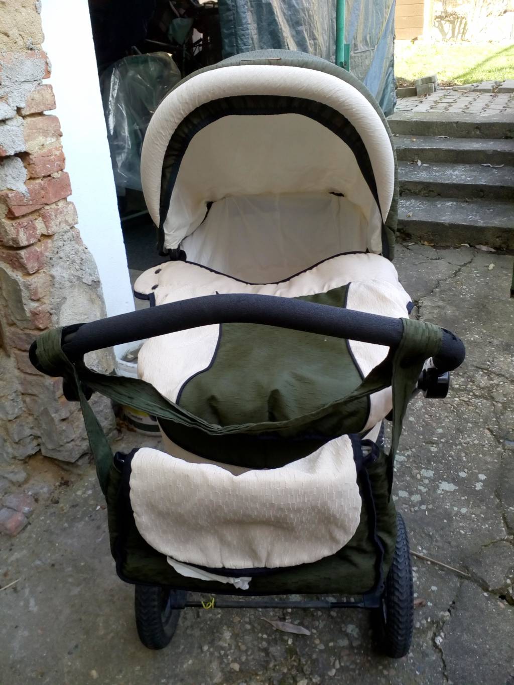 Dětský kočárek s korbičkou + nástavba na sporťák (golfky), barva tmavě zelená - béžová, korba/sedátko je vysoko, gumová nafukovací kola, prostorný koš na podvozku, sklápěcí madlo. Včetně nánožníku, podložky do kočáru, sítě proti hmyzu, tašky na kočár. Ideální na zahradu/balkon či jako druhý kočár (třeba k prarodičům). Není v perfektním stavu, ale jezdit se s ním dá.