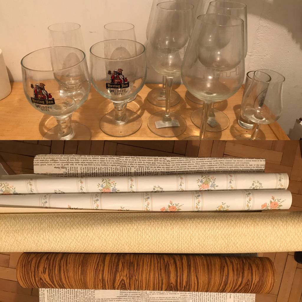 Daruji za odvoz sklo viz foto. Tapety šířky 51-69 cm v celkové délce cca 30 m. Sklenice na víno jsou s nápisem Hilti. K vyzvednutí na Florenci v pondělí a o víkendu během dne, ostatní dny ráno a večer.