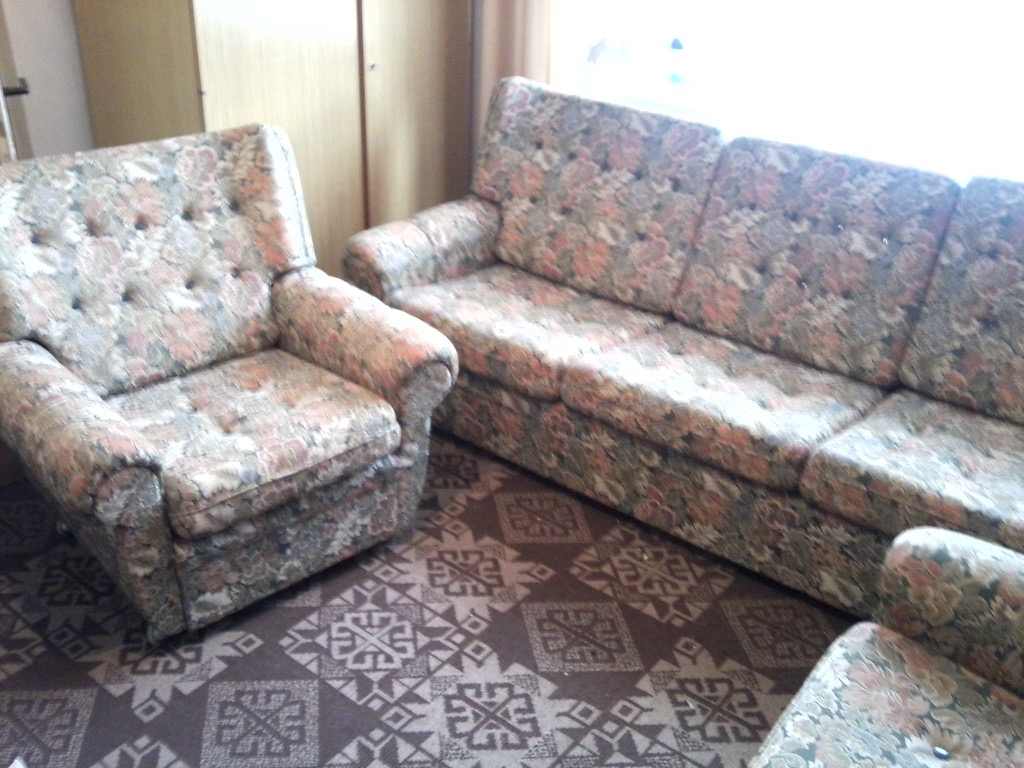 sedací souprava 80. léta, nerozkládací, 2 křesla šíře cca 90cm, trojsedák šíře cca 220 cm, téměř nepoužívaná