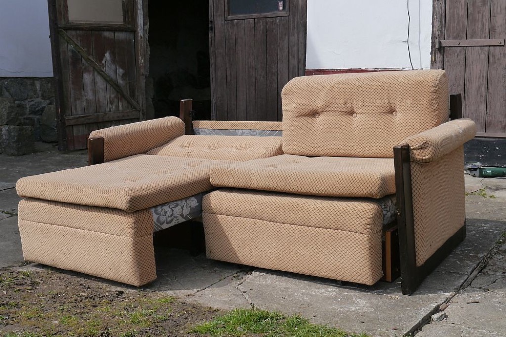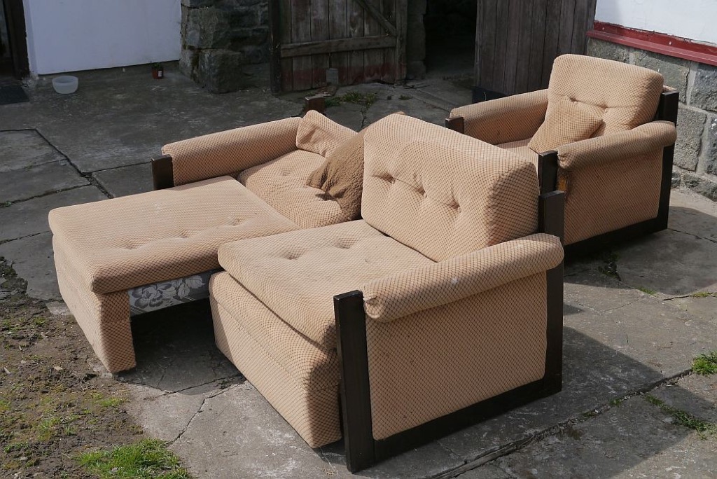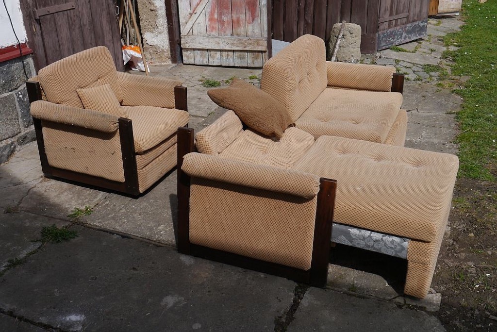 Za odvoz nabízím použitou (poměrně dost, je třeba vyčistit, na některých místech je potah prodřen - u křesla) sedačku, rozkládací na 1,5 lůžko (rozměry po rozložení: š170 x h130 x 70 cm, složená h 75 cm). Funkční, rozmontovaná. Plus dvě křesla (š70 x h75 x v70 cm), na kolečkách. Stav viz foto. Spěchá! Ideálně dnes, 12.4.