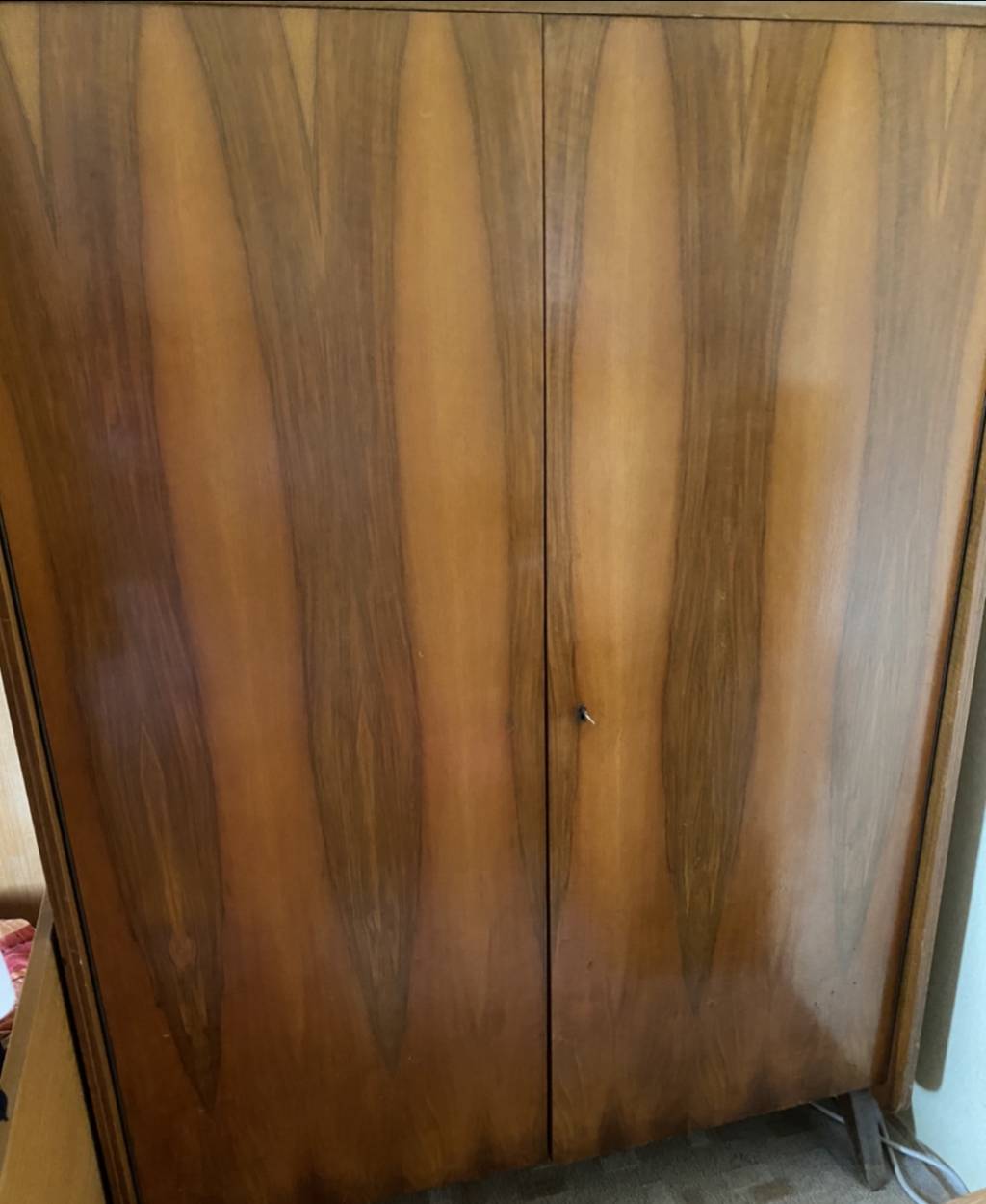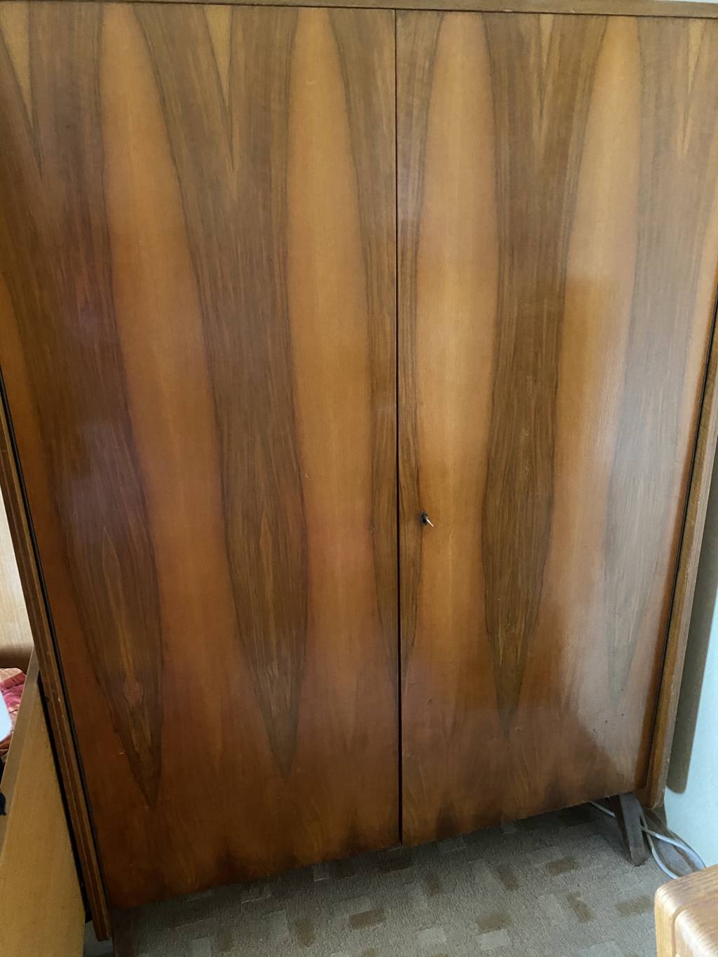 Daruji za odvoz vintage dřevěnou skříň středně hnědé barvy. Kvalitní zpracování; zamykání na klíč. Uvnitř 2x úložné prostory na pověšení oblečení. Nutnost snést ze 6. patra svépomocí.