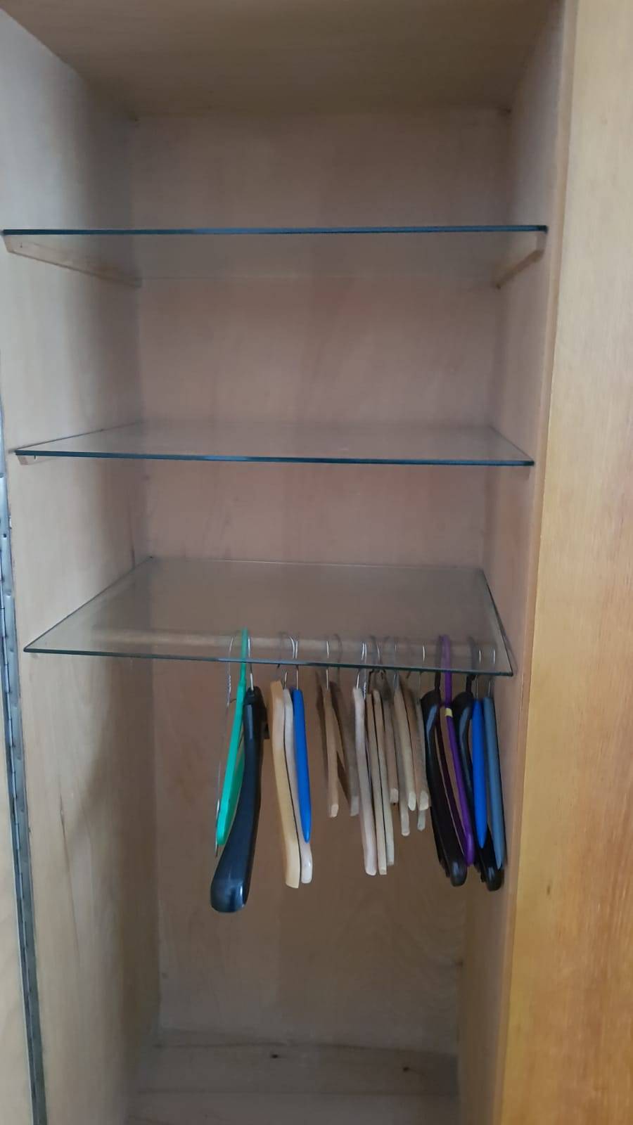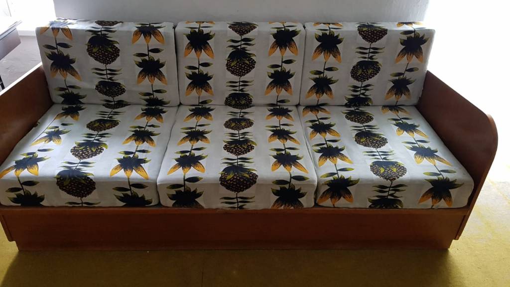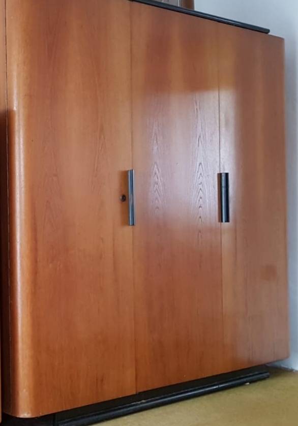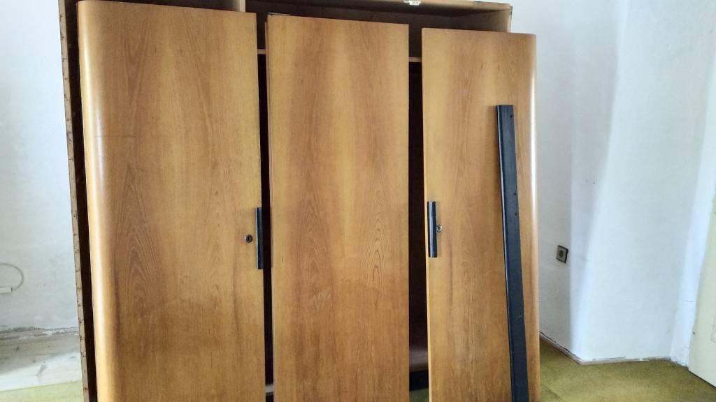 3 dveřová skříň 180 x 183 x 58 cm (přepravní výška 180 cm po odmontování horní lišty, z přepravních důvod odmontované dveře), gauč 195 x 80 x 82 cm, kuchyňská linka 180 x 177 x 60 (30) cm masiv lakovaná, 3. dveřová skříň 160 x 183 x 50 cm masiv lakovaná se zrcadlem, hodiny bicí na skříň.