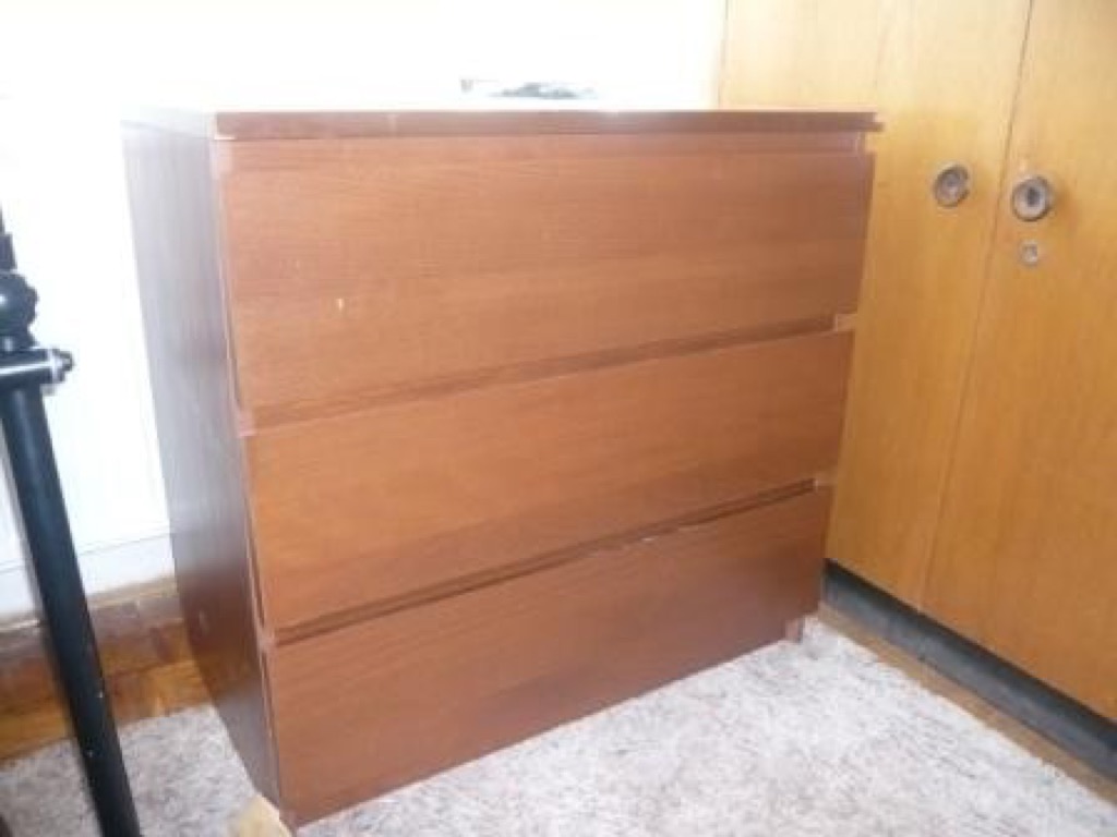 tmavě hnědá komoda se 3 zásuvkami z Ikei, místy trochu odřená, ale funkční, viz. foto
