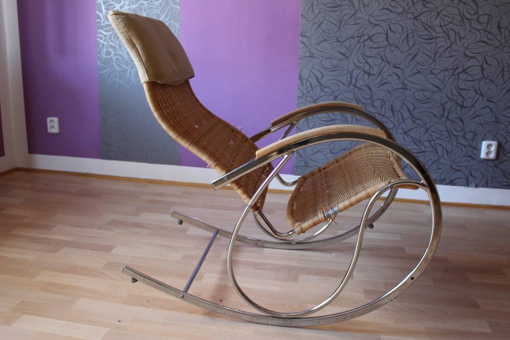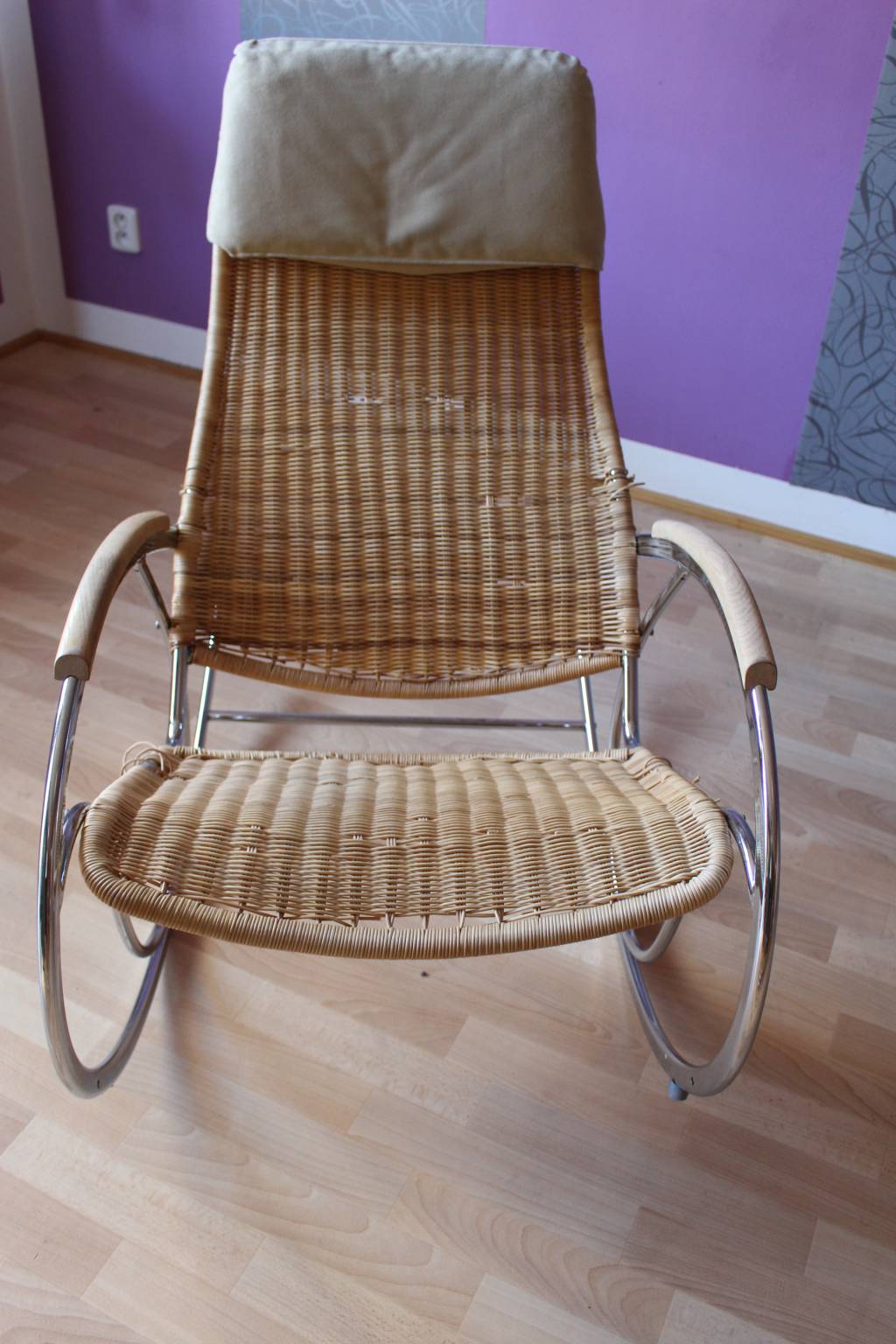 Daruji za odvoz...houpací křeslo s hlavovou opěrou....v kombinaci chromované oceli a světlého ratanu. ROZMĚRY: šířka 60 cm, výška 100 cm, hloubka 100 cm. Nosnost cca 90 kg. Bude třeba nutná oprava ratanového výpletu sedáku i opěry - viz. fotografie...jinak v pořádku.