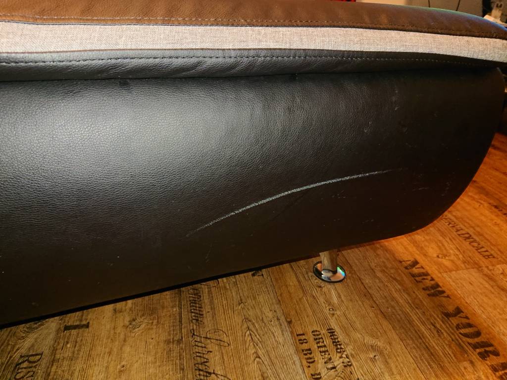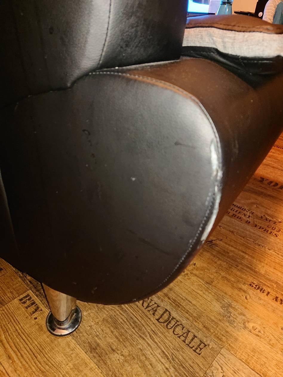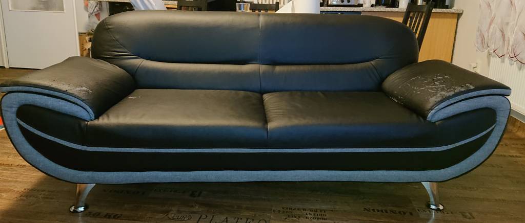 Daruji za odvoz černý koženkový gauč. Pohodlně se na něj vejdou dva lidi, oficiálně je pro tři. Není rozkládací ani nemá úložné prostory. Nohy jsou kovové zvednuté (projede pod ním vysavač). Koženka se loupe a na dvou místech je lehce povrchově potrhaná. S přehozem nebo potahem plně funkční (nabízíme, neboť nám je už malý). Stav viz. foto. Šířka cca 2 m, místo na sezení 132 cm, hloubka 90 cm, hloubka sezení 60 cm, výška 83 cm.