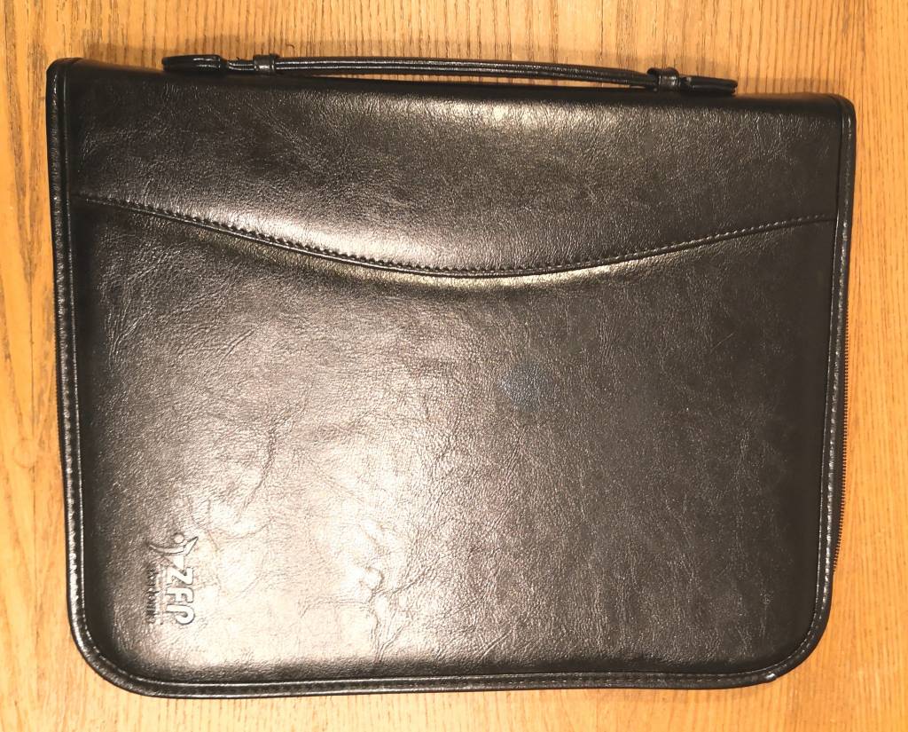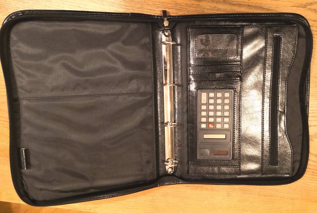 Daruji černou koženkovou slohu na dokumenty se zabudovaným kroužkovým pořadačem a kalkulačkou.
