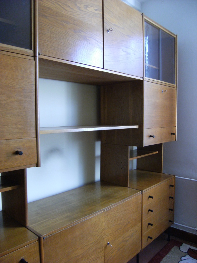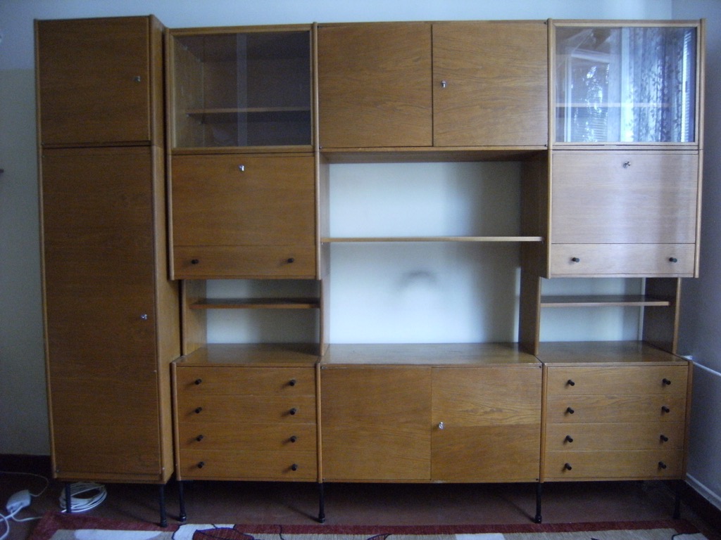 Nabízím za odvoz tuto starou obyvákovou stěnu. Je složena ze dvou samostatných částí: skříň nalevo a sestava vlevo, která lze dále rozložit na menší úseky.