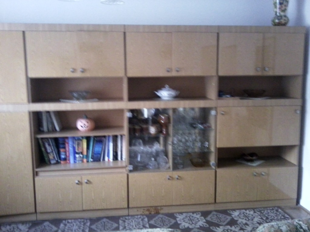 Obývací stěna Favorit - Německo, 80. léta, čelo lesk, šíře 392cm, výška 206cm, lze rozdělit na 8 dílů (spodky + nástavce) po 98cm.