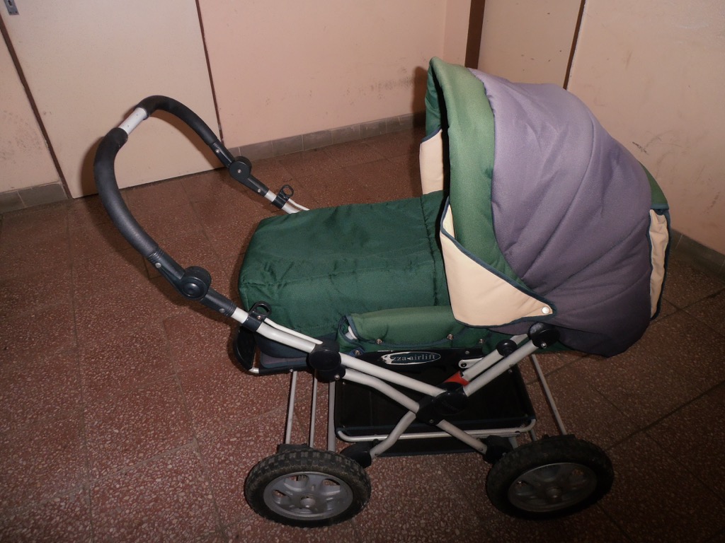 DARUJI starší kočárek trojkombinace (modro-zeleno-žlutý). Bouda už šislá. Nafukovaí kola. Vytahovací vana. Přehazovací ručka. Šířka kol asi 65 cm ..
