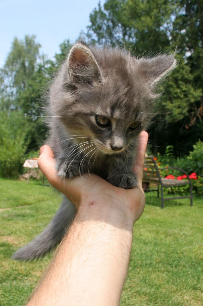 Daruji šedou, dlouhosrstou kočičku narozenou začátkem května. Je velmi živá a samostatná. Spěchá.