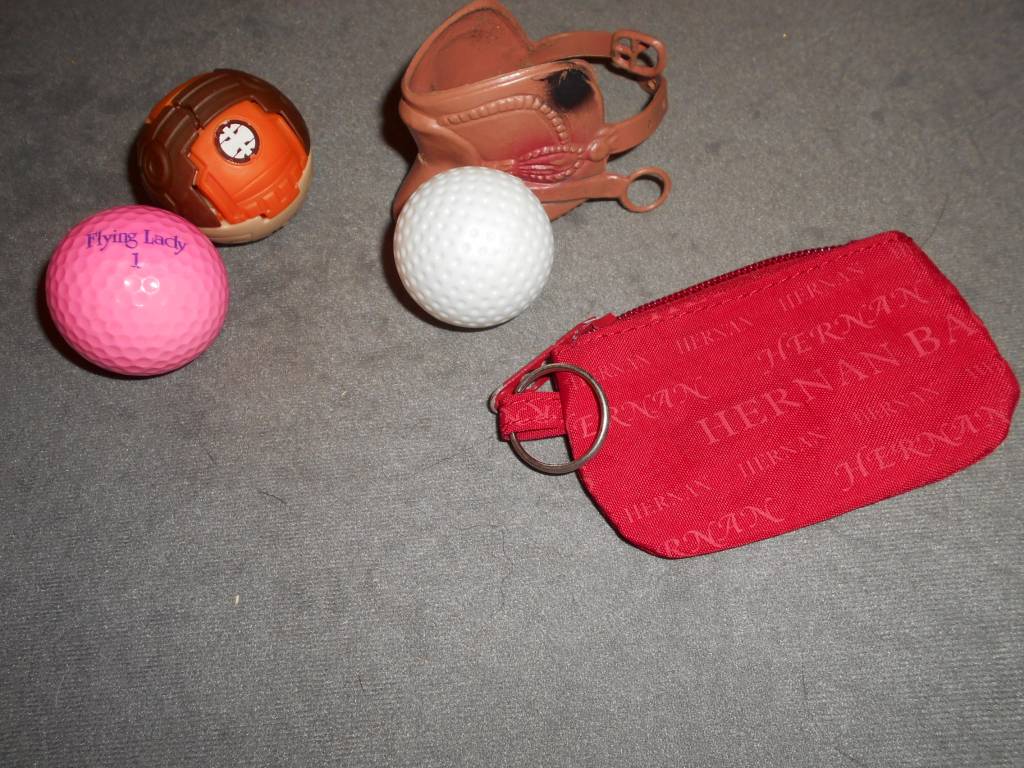 růžový golfový míček, sedlo na koníka, taštička atd.