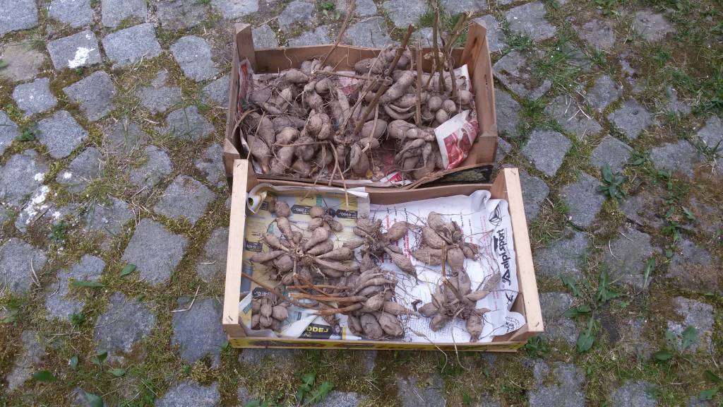 Daruji za odvoz hlízy jiřin - většinou červené + nějaké bílé a růžové, ale neroztříděné.