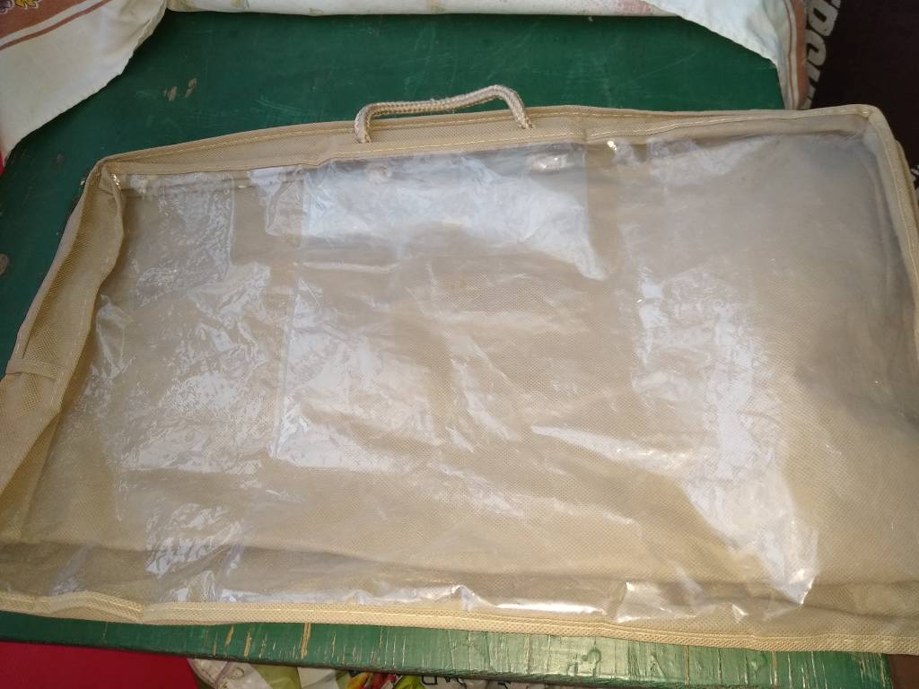 Obal velikosti asi 40x40x10 cm, z jedné strany průhledný,ucho na odnesení.
