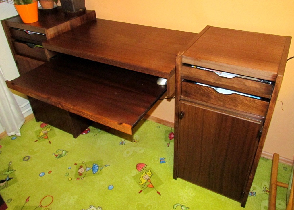 Má celkem 4 šuplíky a 2 skříňky + výsuvný díl na klávesnici. Jsou na něm skvrny od vody a místy vybledlá barva.