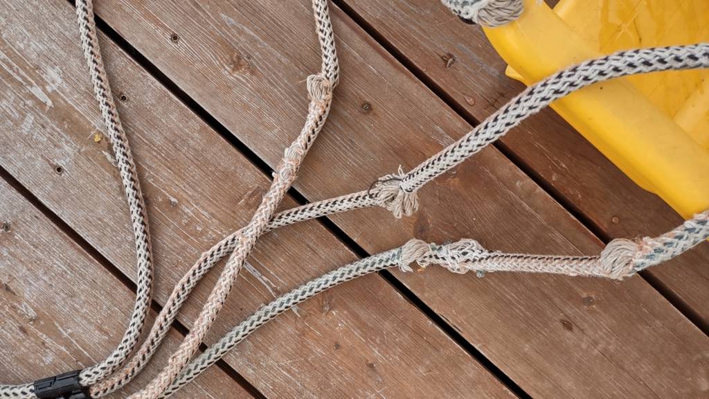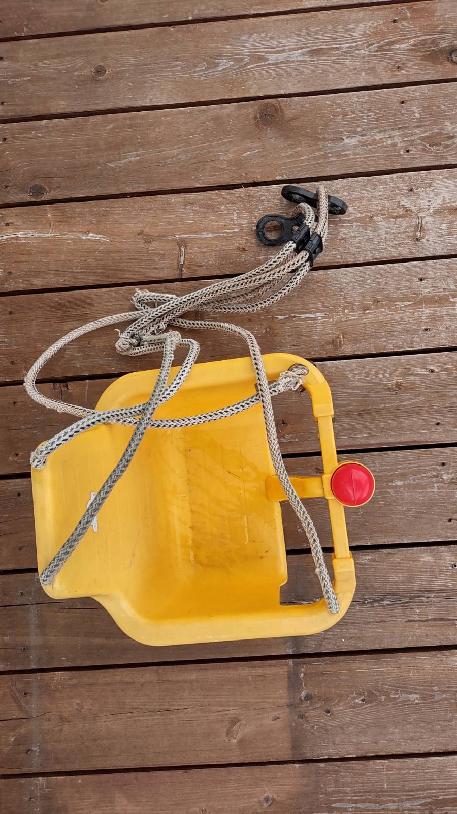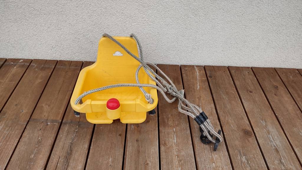 Dětská plastová houpačka, pravděpodobně nutná výměna lan (ale jeví se pevně) - viz foto.