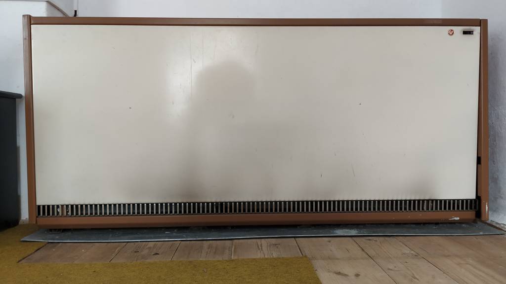 včetně termoizolační podložky v zachovalém stavu, topná část funkční, tělesa měněna, ventilátorová jednotka vyžaduje repasi ložisek.