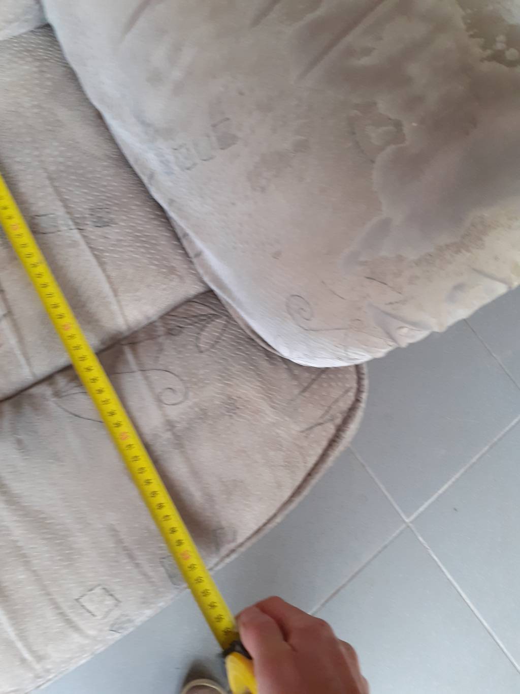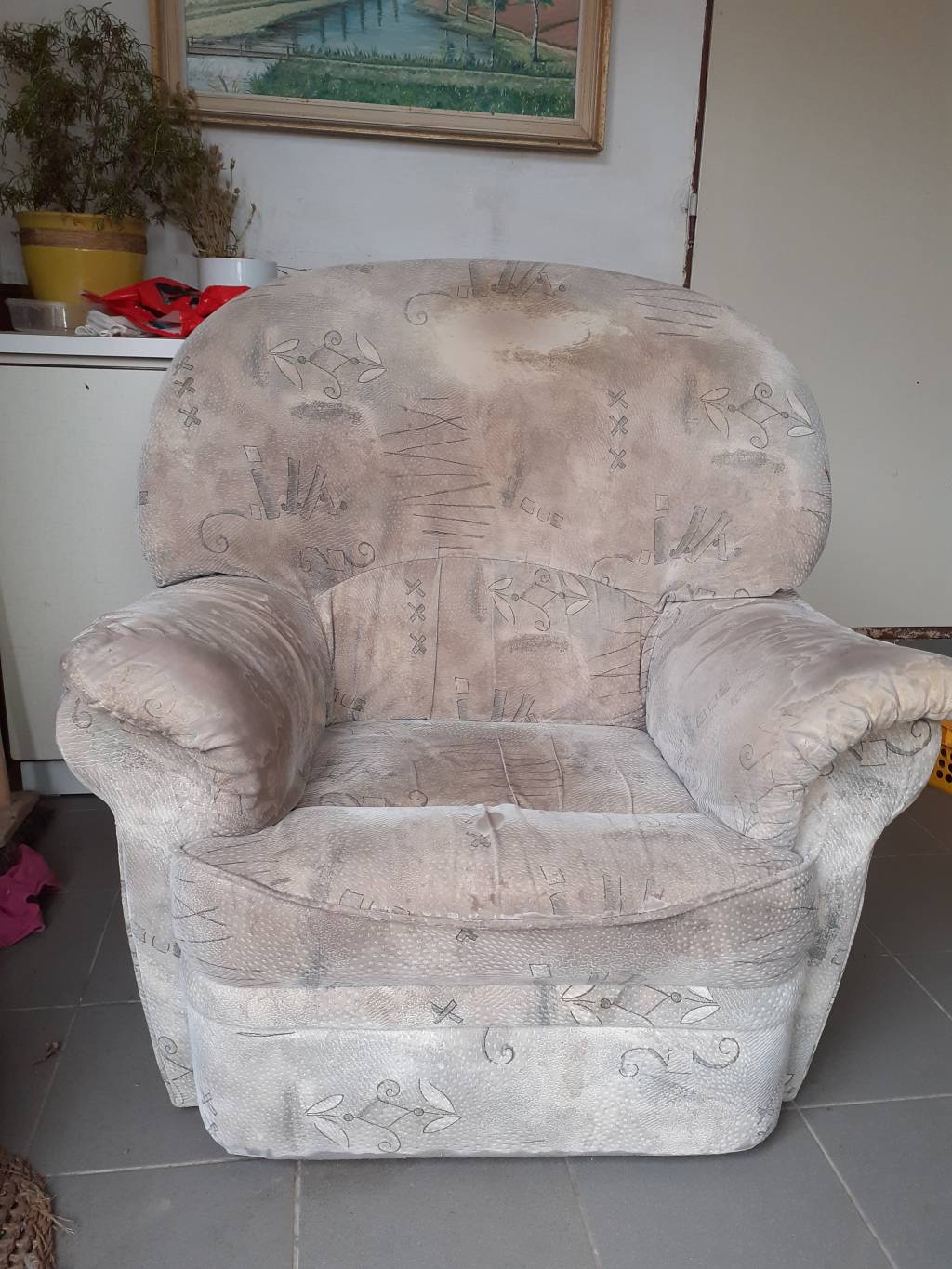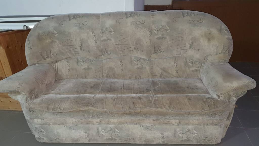 Daruji za odvoz sedací soupravu tvořenou třímístnou sedačkou a křeslem. Sedačka je rozkládací. Výška je 102 cm, délka 203 cm, šířka sezení 145 cm, výška sezení 40 cm a hloubkou sezení 52 cm. Křeslo má šířku sezení 48 cm. Potah je svétlý, barvy béžová a šedá. Potah je na některých místech prošoupaný, nejvíce na opěrkách na ruce, problém by vyřešilo nové čalounění či napínací potah. Konstrukce sedačky je robustní a tuhá. Sezení je spíše tužší, není prosezená. Přednost mají zájemci o celou soupravu.