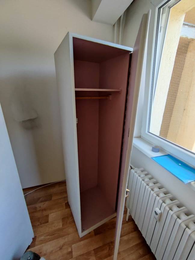 Každá šatní skříň má jednu šatní tyč, jednu poličku a uzavíratelné dveře. Úchytky nejsou původní. Rozměr jedné skříně je 53x180x50 (š, v, h).
