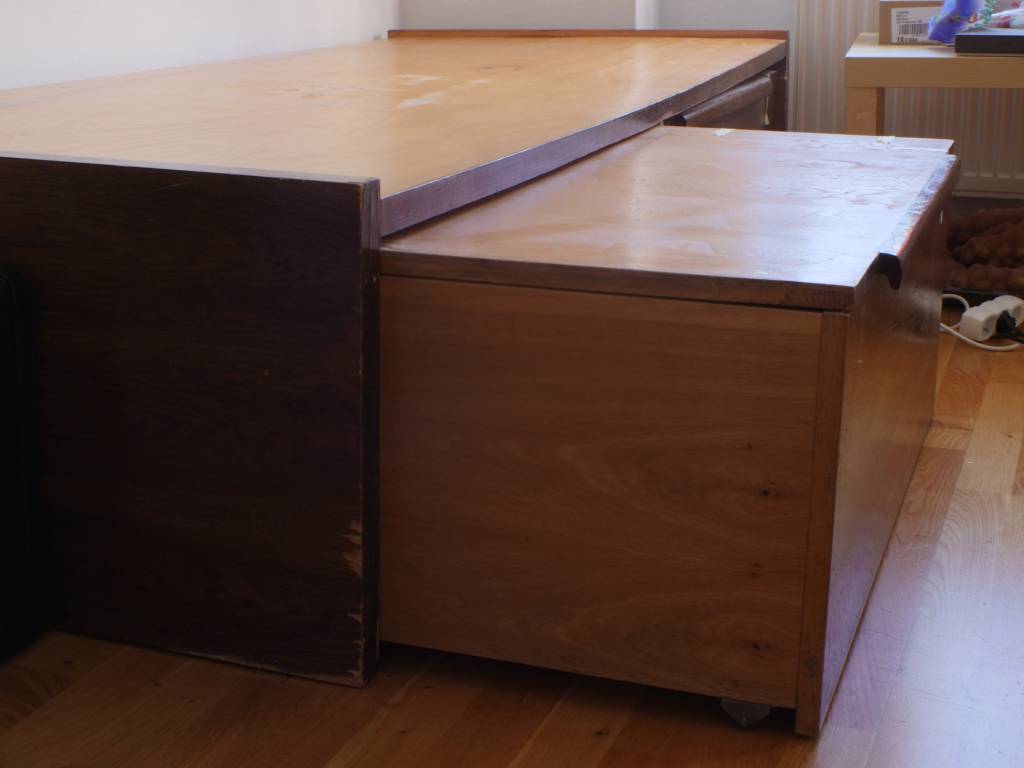 Dřevěná masivní postel se dvěma objemnými výsuvnými šuplíky/peřiňáky na kovových kolečkách. 70. léta (dvacátého století :-)), zakázková výroba. Horní deska poškrábaná od pera z matrace. Celková délka 203cm, ložná plocha 195cm, šířka 85cm, výška postranice 45cm, jeden šuplík výška 38,5cm včetně víka, šířka 98cm, hloubka 43cm.