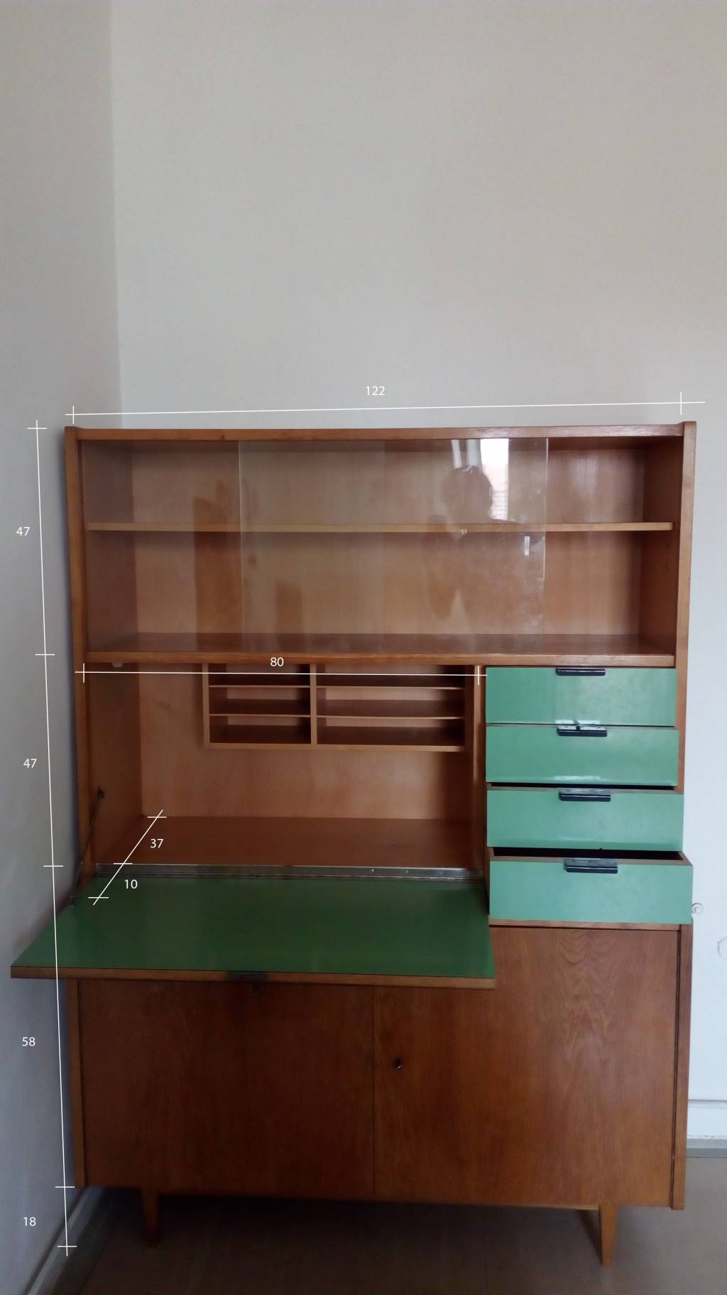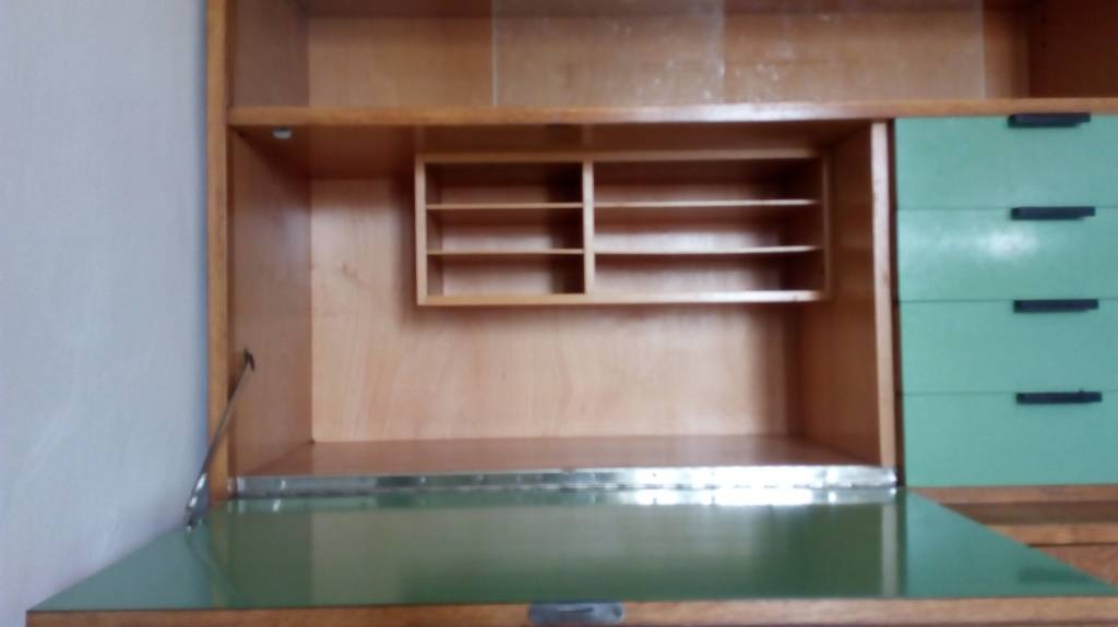 Nabízím skříňku / poličku. Bruselský styl. Nepoškozená, v pěkném stavu. Celé jeden kus. Zámky fungují. Jednoduchá úprava výšky poličky - viz foto. Do vyklápěcí části je dodatečně namontovaný díl přihrádek - viz foto.