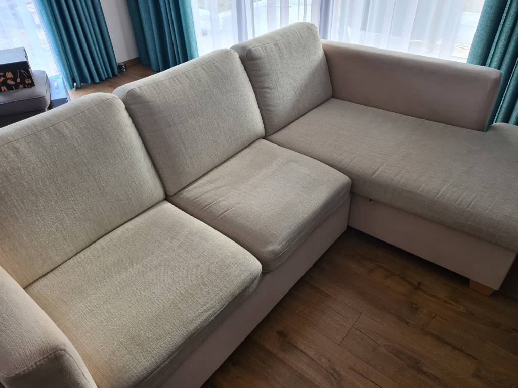 Daruji za odvoz rozkládací pohovku ve tvaru L od firmy Polstrin, stáří asi 12 let. Sedáky přepolstrovány asi před 3 roky. Potah je odolný a dobře se čistí, přežila řádění jednoho dítěte. Sedáky nejsou prosezené, ještě pár let někde dobře poslouží. Nohy jsou z masivních hranolů. Pro převoz lze pohodlně rozdělit na dvě části. Bude volná jen pár dní, pak putuje na sběrný dvůr. Rozměry viz nákres. Předání v Hoděšovicích (Býšť) u Hradce Králové.