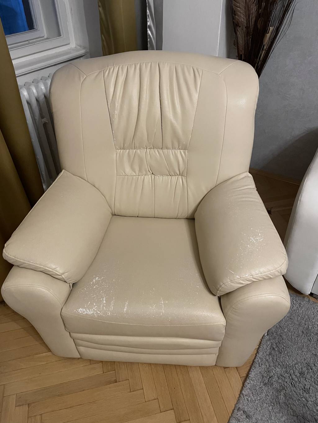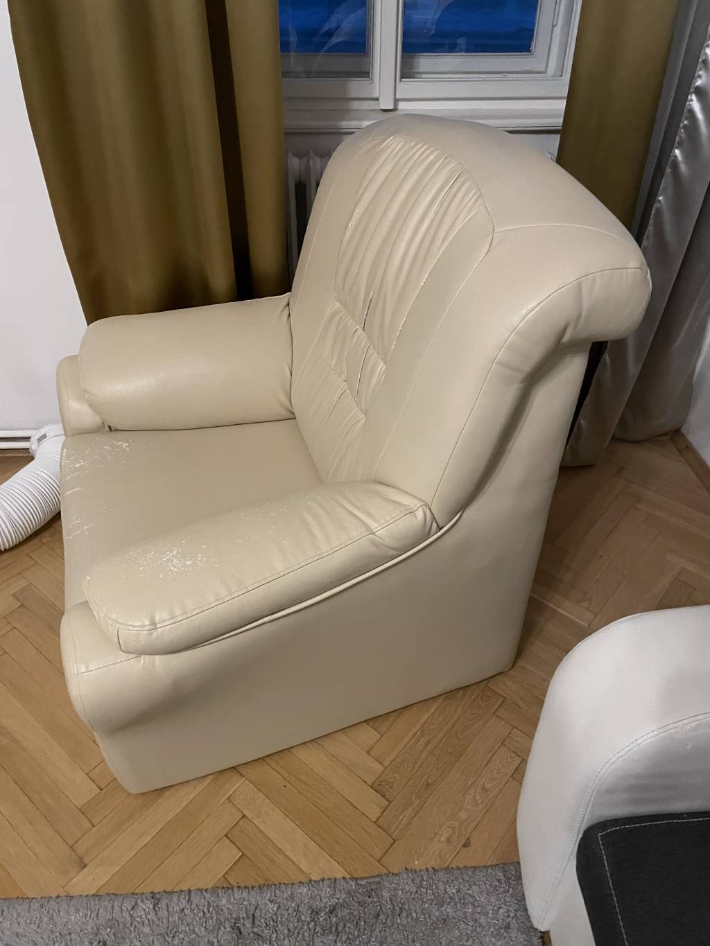 Daruji za odvoz z Prahy 1 křeslo z umělé kůže, mírně odřené běžným používáním jinak velmi pohodlné