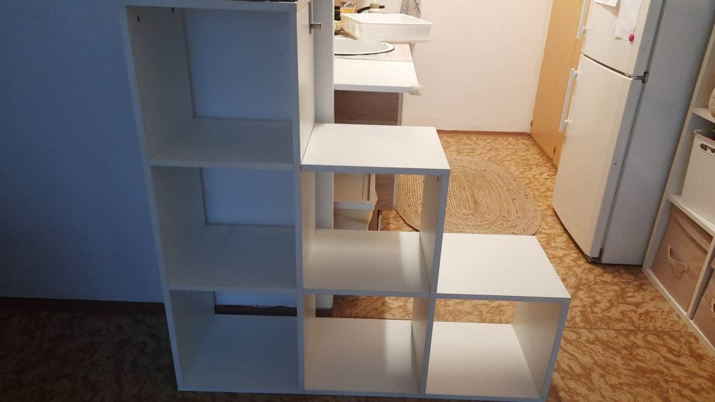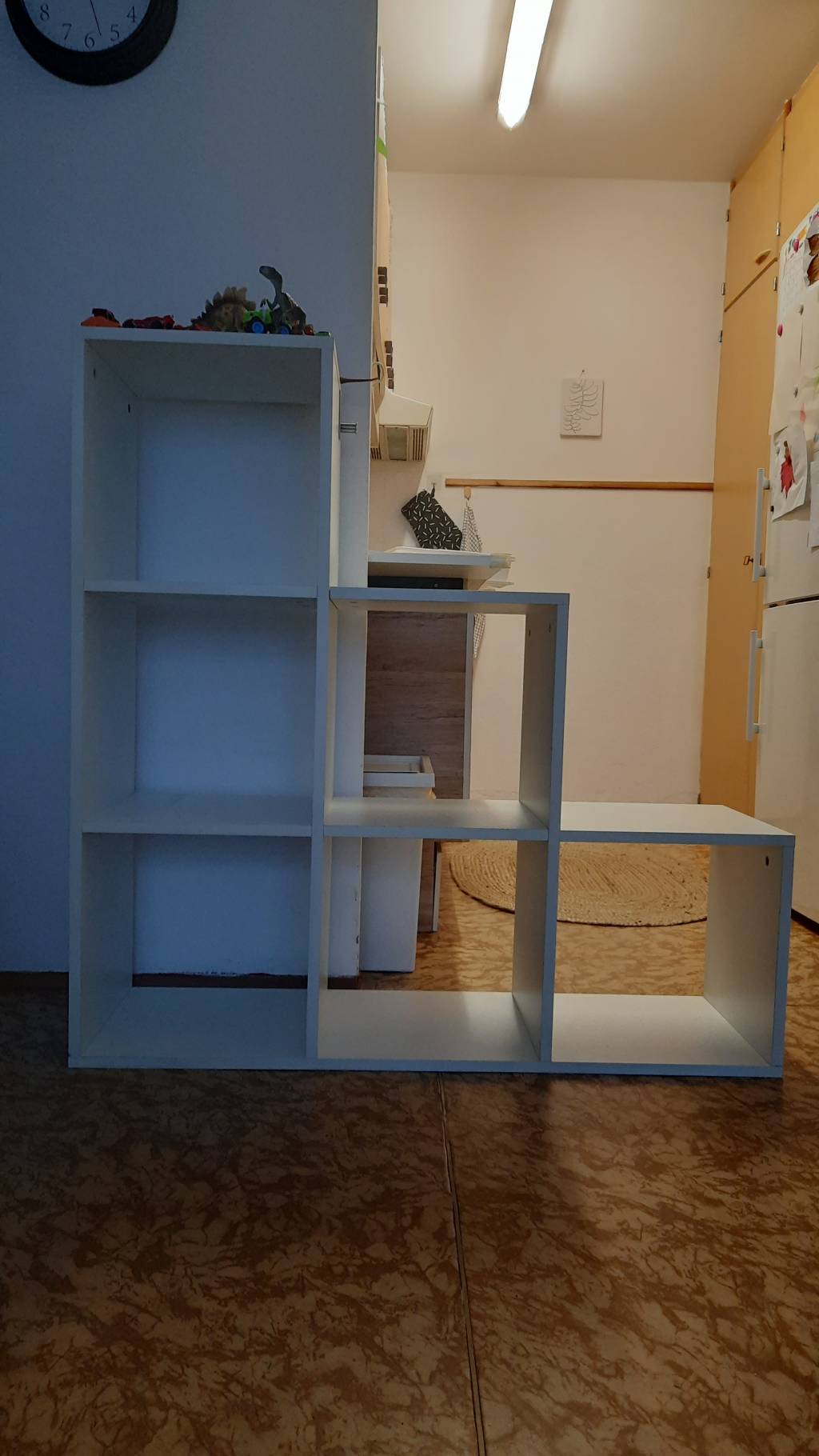 Daruji za odvoz tento regal. Meli jsme ho doma uz nokolik let, takze neni v uplne top stavu (chtel by poradne vycistit a dotahnout srouby), ale vypada a slouzi stale dobre. Na delku ma 113 cm, na vysku 112 a sirka jednotlivych polic je 35 cm. Vejdou se do nej takove ty klasicke boxy z IKEA - max 34x34 cm.