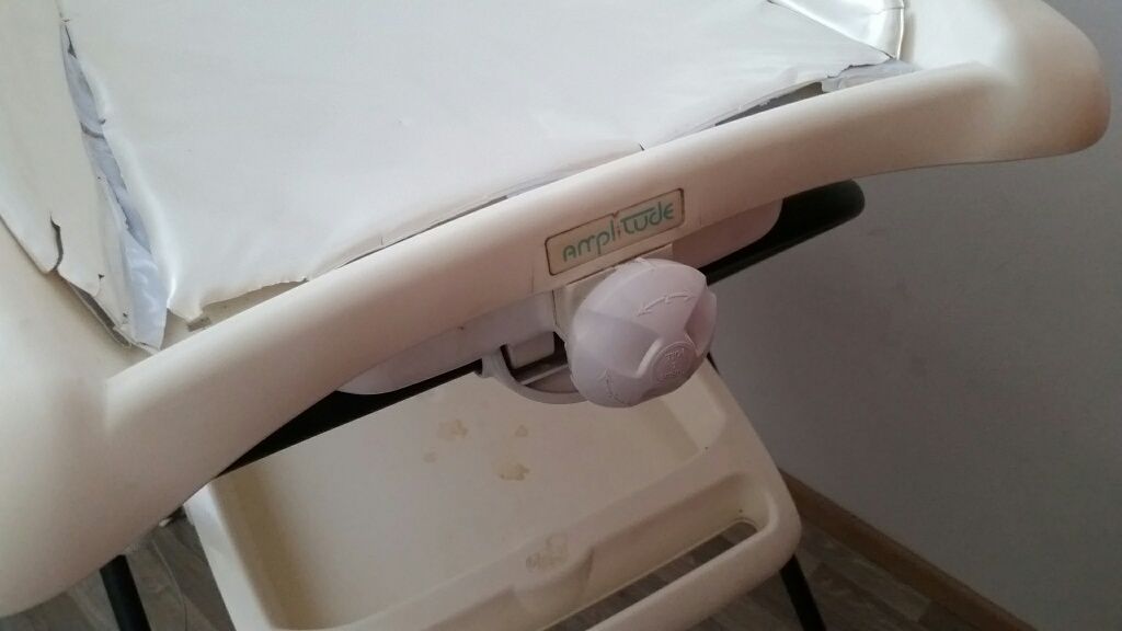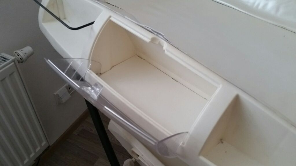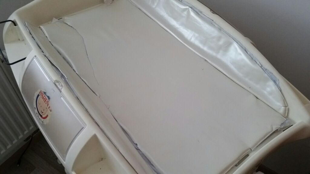 Přebalovací pult má chybějící přebalovací matraci a roztržená slída na matraci, ale dá se velmi snadno přichytit, případně vložit jinou. Původní cena 2500 Kč.