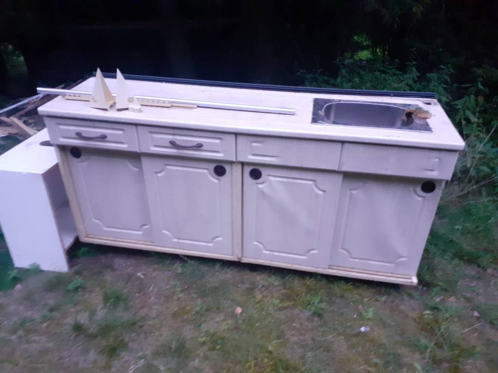 Stará kuchyňská linka z chaty, s dřezem. Mohu změřit. Hloubka menší než standardní. 2 šuplíky. K odvozu do pátku. Různé povrchové vady, které nemají vliv na funkci.