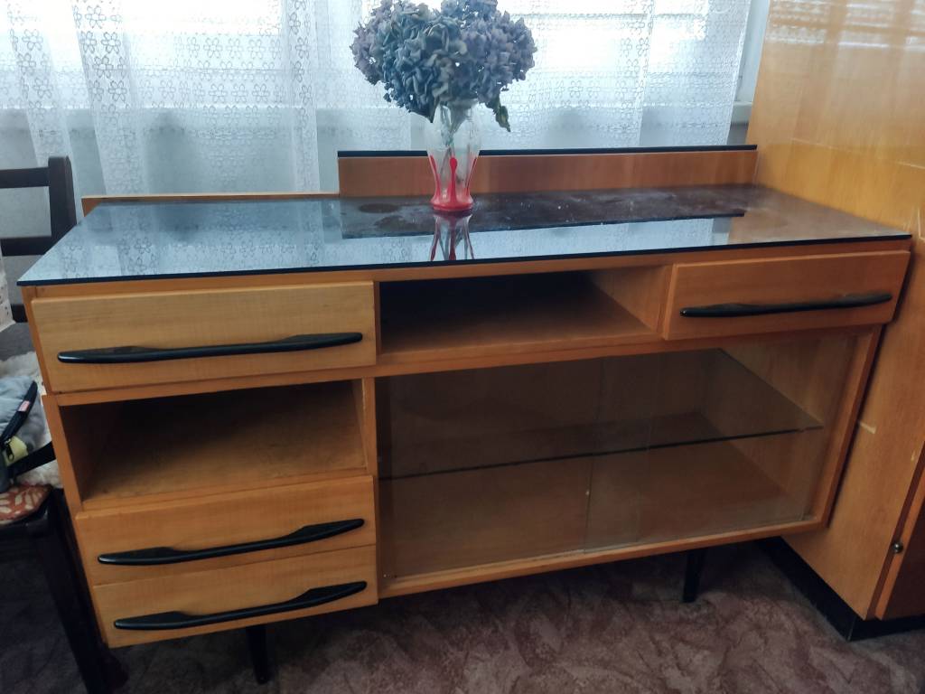 Daruji za odvoz noční stolek z 60. let, na vrchní straně černé sklo, rozměry š.125 cm, v. 75 cm, h. 45 cm.