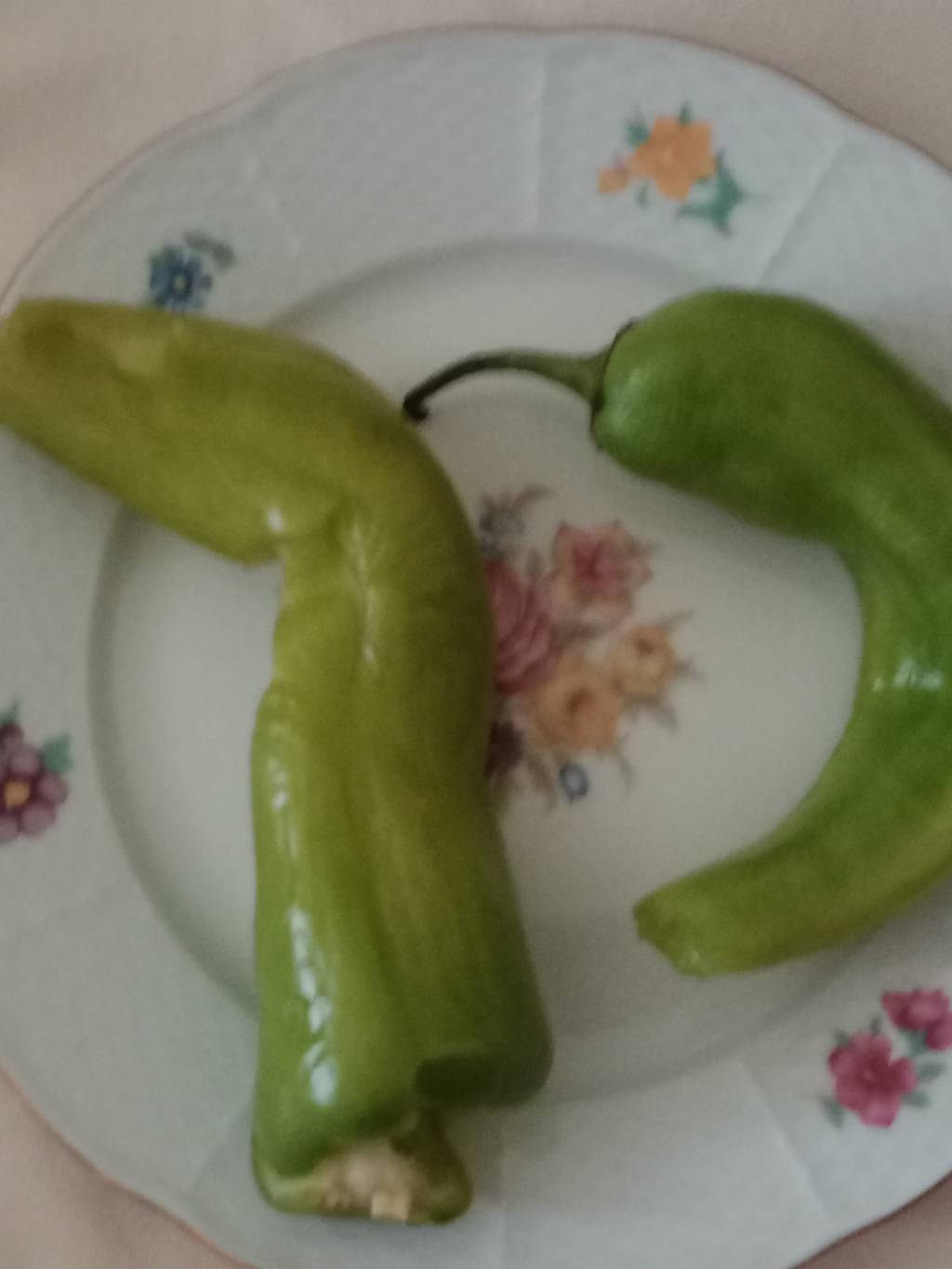 Jedna paprika je rozkrojená s vybranými semínky,teprve pak začala pálit, druhá má odkrojenou špičku kvůli ochutnání.