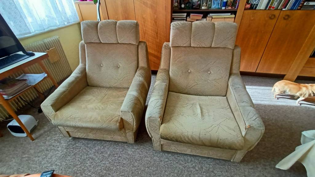 Daruji za odvoz 2 křesla - světlé barvy, použitá. Pohodlná! Výška: 96 cm, š. 83 cm. Nutný vlastní odvoz a snos ze 3. p. po schodech (do výtahu se nevejdou).