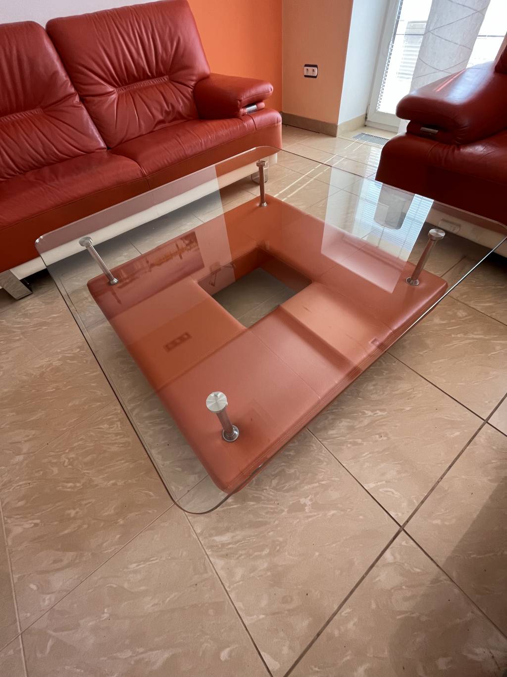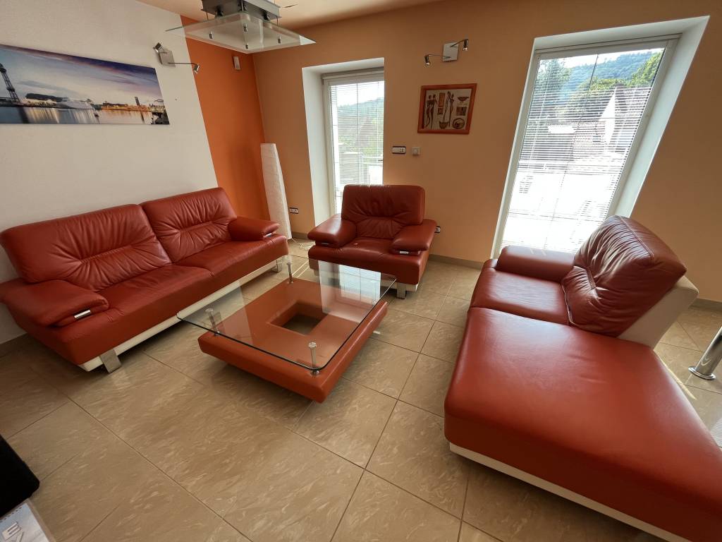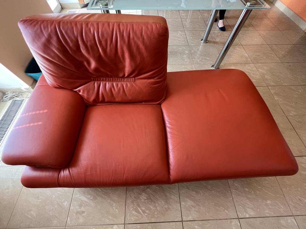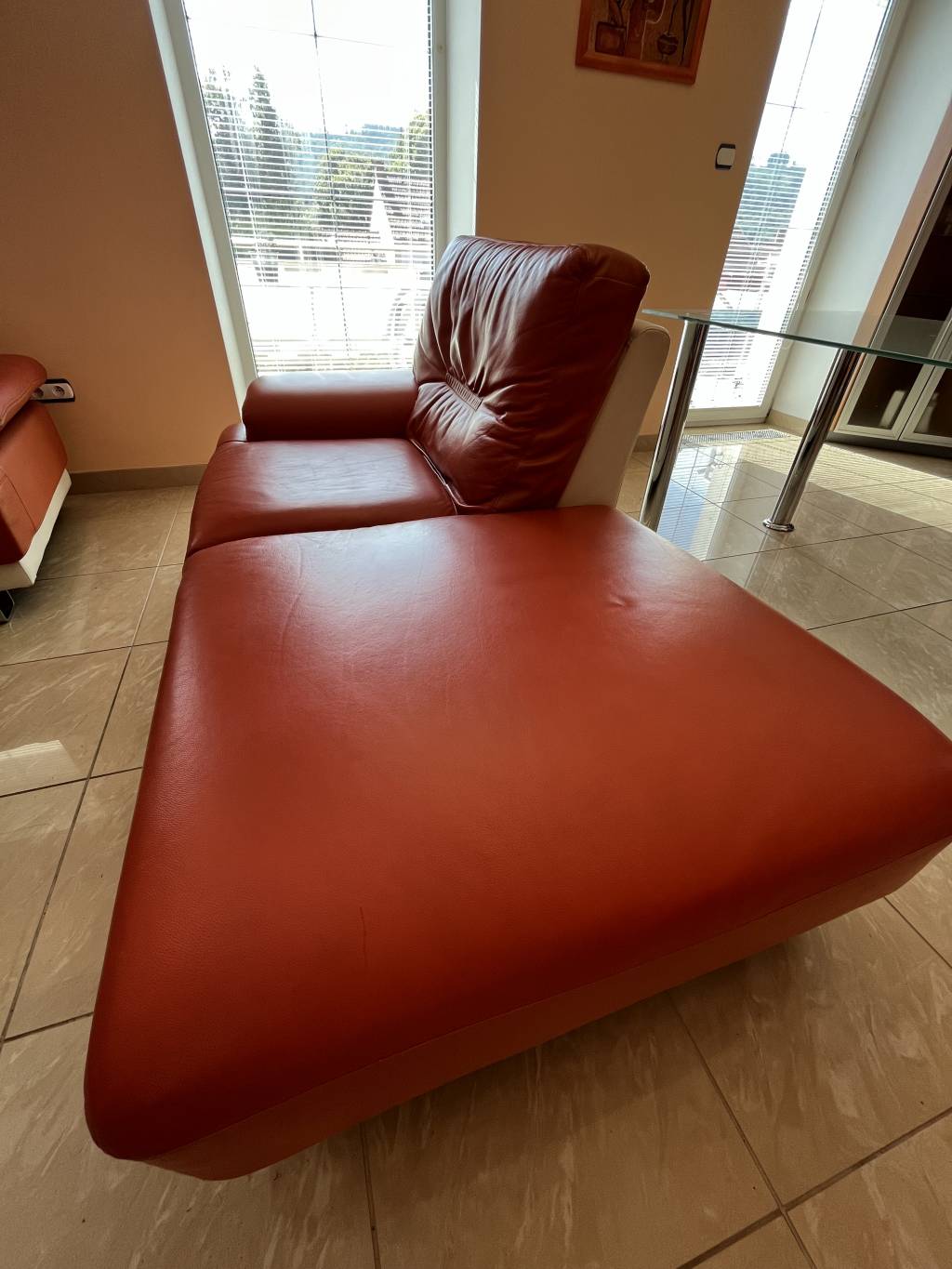 Oranžovo bílá kožená sedací souprava v mírně použitém stavu.