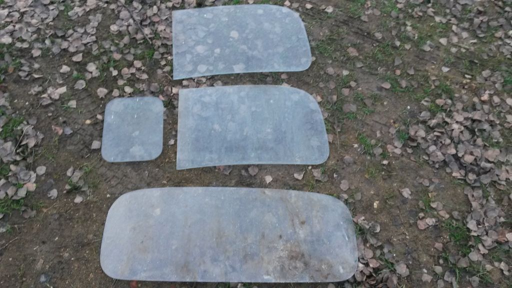 Zadní a boční skla ze starého auta, pravděpodobně Volhy (po předchozím majiteli domu). Byla uložena ve slámě na půdě.