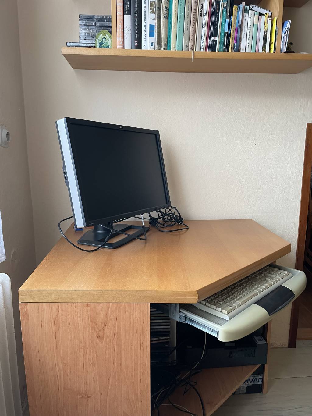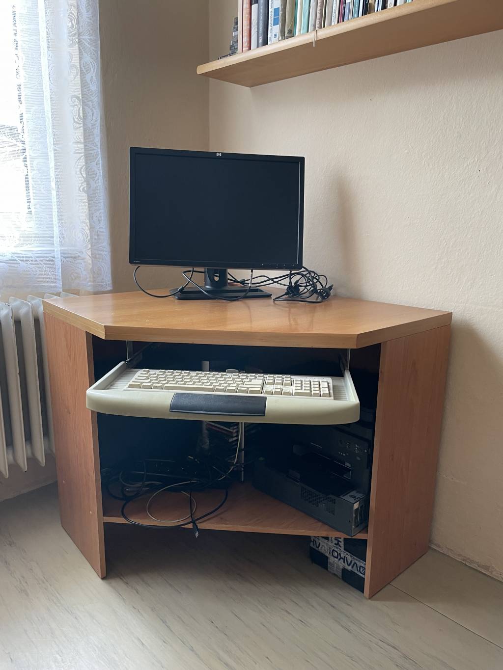 Dřevěný stůl ideální pro roh místnosti s vysouvatelnou klávesnicí a úložným prostorem v dolní části. Stůl má také vývod pro kabely. Je v vynikajícím stavu. Rozměry 80 x 95 cm (delší strany) x 80 cm (výška).