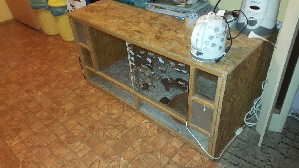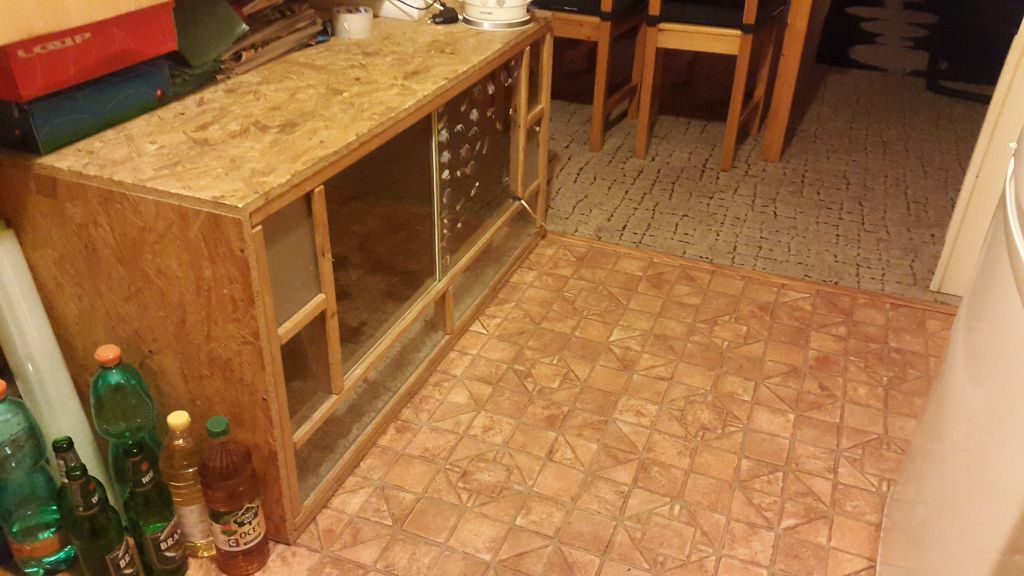 Daruji terárium za odvoz. Materiál z dřevotřísky, chybí přední skla