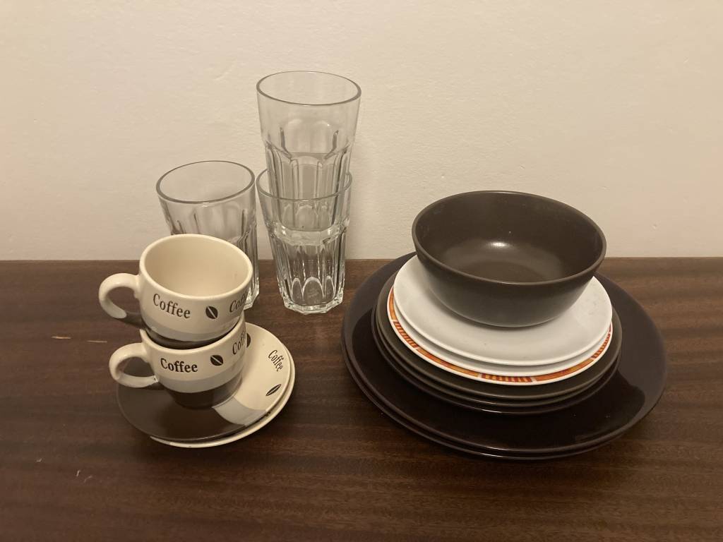 Daruji za odvoz pánev wok s víkem, různé talíře, hrnky a sklenice - používané, ale bez oťuků, v dobrém stavu