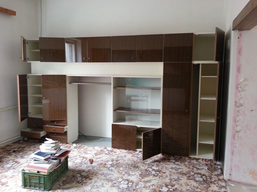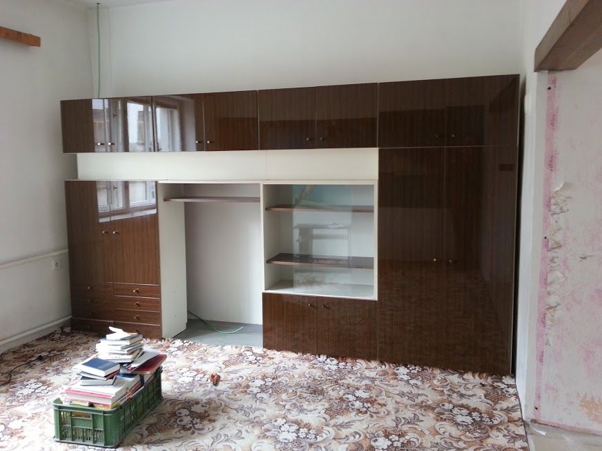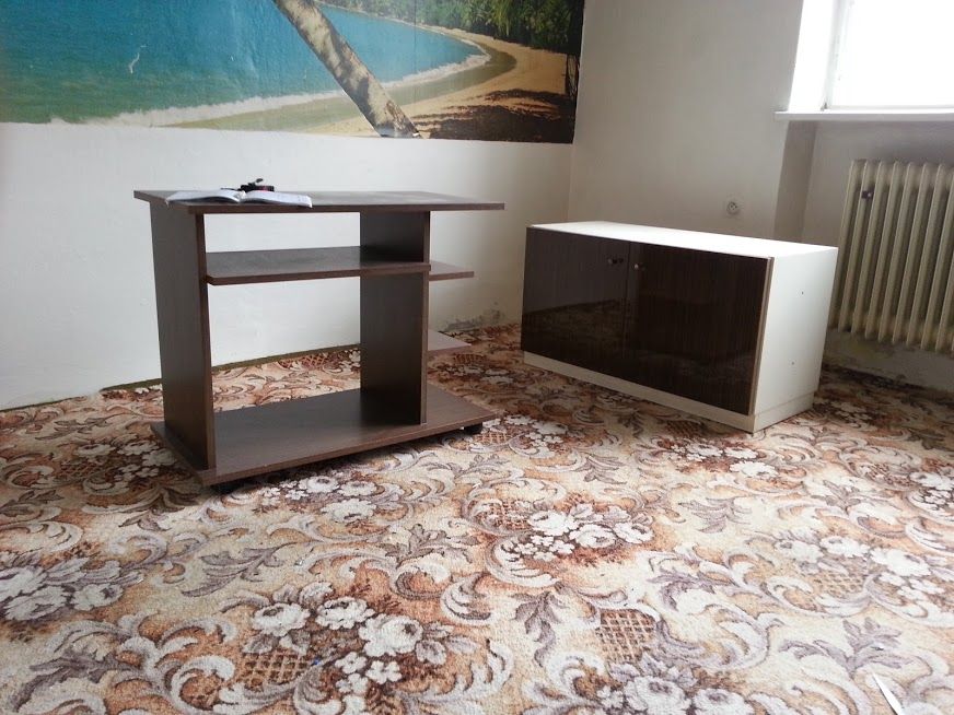 Obývací stěna, rozšroubovatelná na základní skříňky. Bez vad na kráse. K dispozici ještě jedna skříňka navíc a stoleček na TV (na kolečkách) umístitelný do mezery mezi skříňkami.
