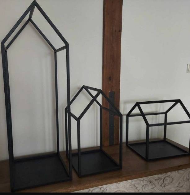 Daruji za odvoz celokovové domečky vhodné pro dekorativní účely do interíeru i exteriéru. Používané krátce. Sloužily jako stojan na kytky (popínavé). Původně jsou určeny jako stojan na štípané dřevo ke krbu. Rozměry: Velký -v100 x h 37 x š36. Střední- v55 x h 31 x š31. Malý - v40 x h 40 x š30.