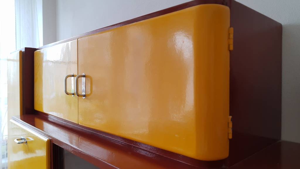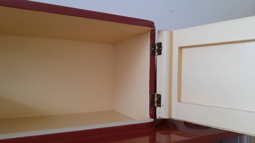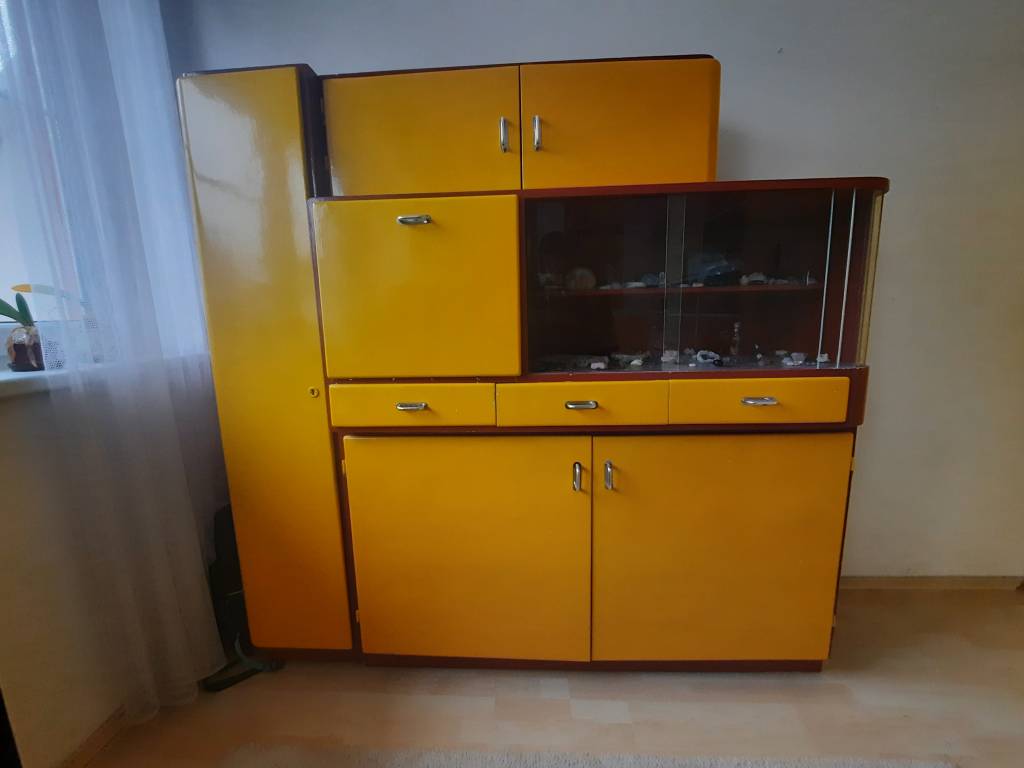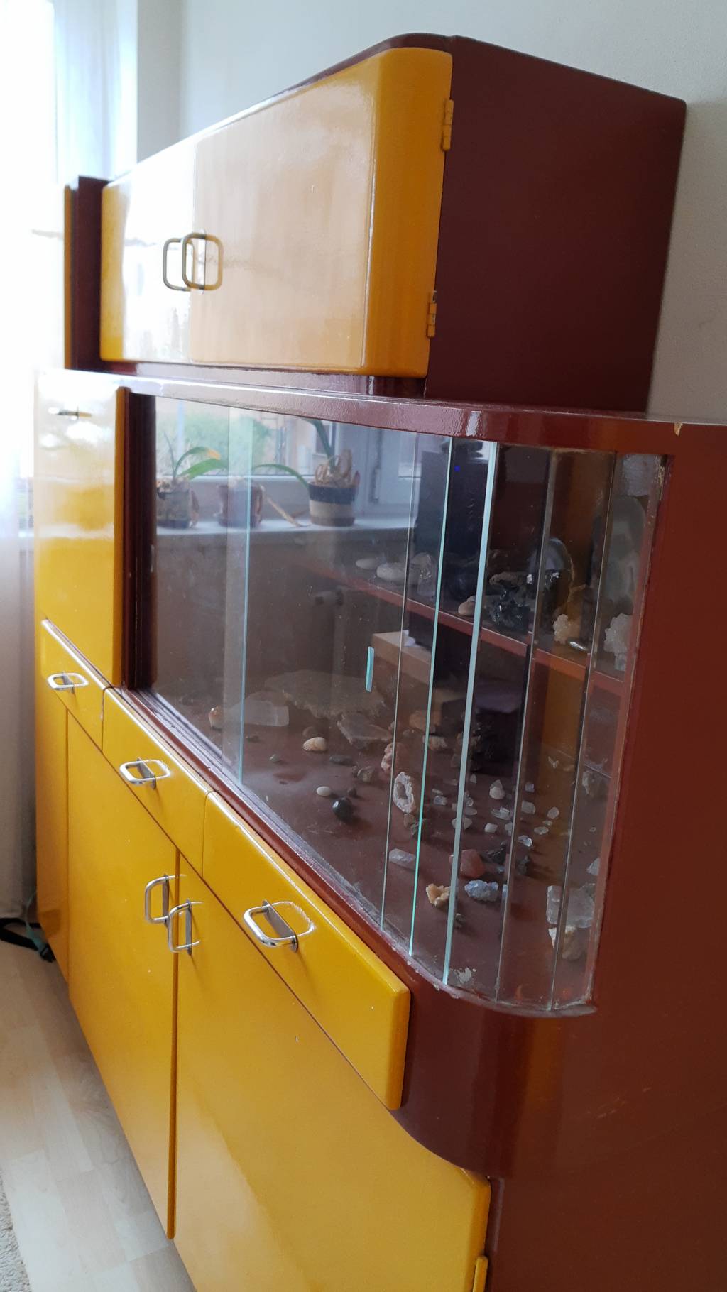 Kredenc 50. léta, masiv, přelakovaný na barevno. Má všechny části včetně skel a původního kování. Jsou potřeba drobné opravy kování a pantů.
