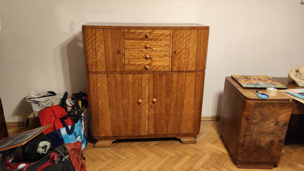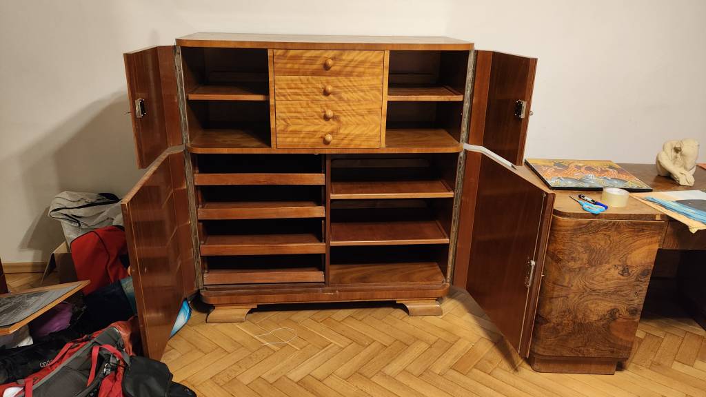 Daruji za odvoz skříň z masívu. Vlevo dole vnitřní šuplíky a vpravo poličky. Uprostřed nahoře šuplíky a po stranách poličky.